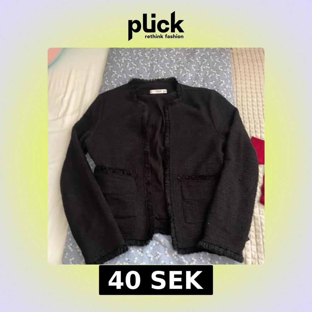 Stilren svart kavajjacka från Mango med fransade kanter och två fickor framtill. Jackan är i ett strukturerat tyg och har en klassisk, rak passform utan knäppning. Perfekt för att lyfta vilken outfit som helst.