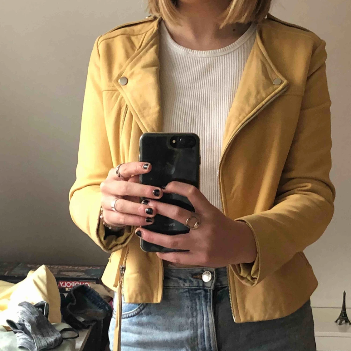 Beige/gul skinnjacka från mango. Köpt för 500, nypris 150. Jättebra skick, bara använd fåtal gånger.