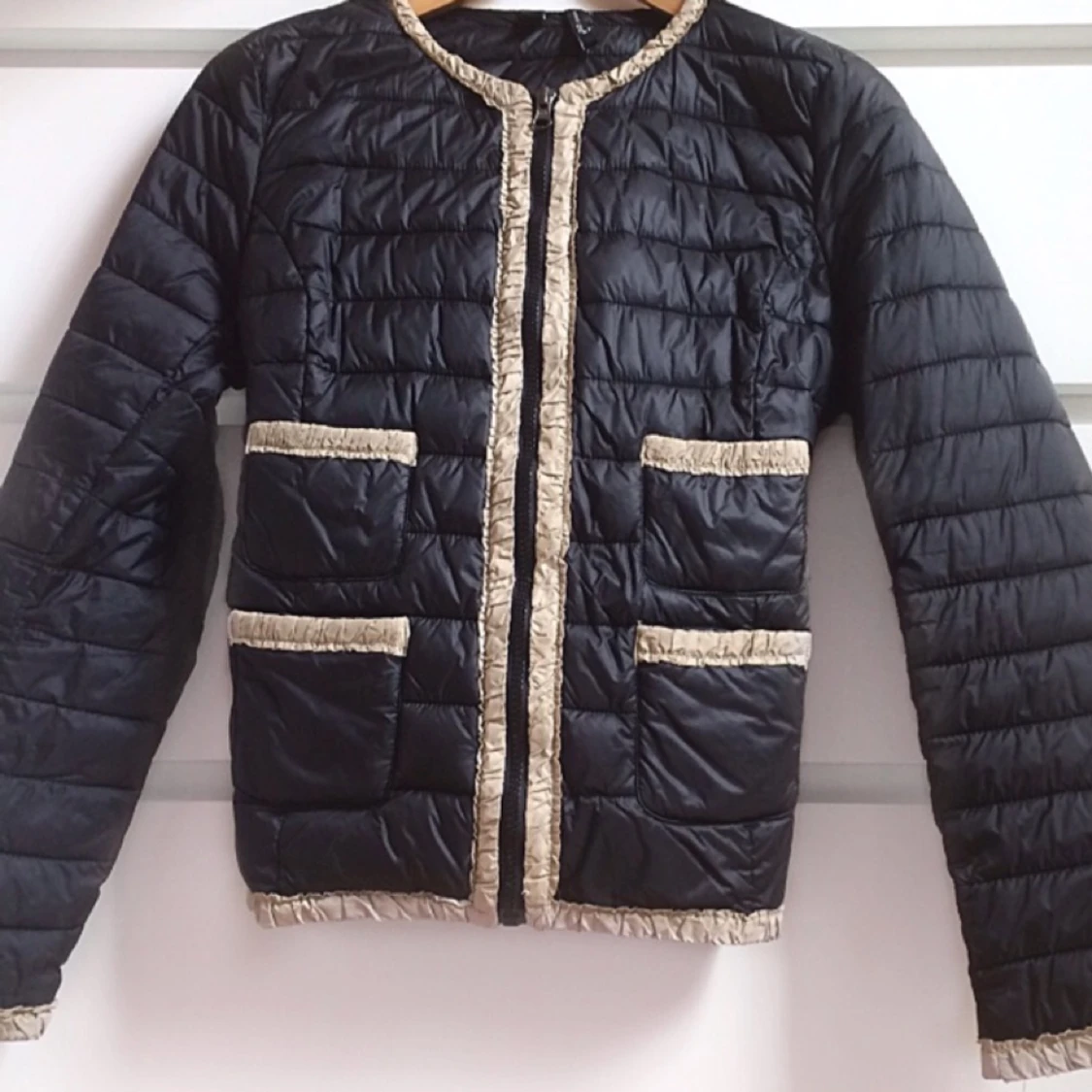 Tunn dunjacka/lättviktsjacka från Mango. Svart med beiga detaljer. Fyra fickor och knäppning med dragkedja. Mycket gott skick, använd vid två tillfällen.