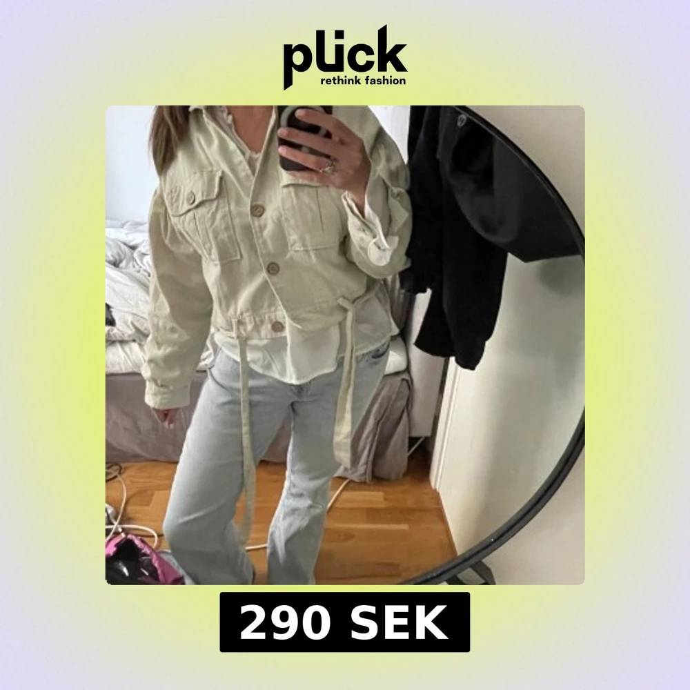Beige jeans jacka från Sinsay med knappar framtill, två stora bröstfickor och knytband i midjan. Jackan är croppad och har långa ärmar med knapp vid ärmslut. Perfekt för lager-på-lager och chill stil.