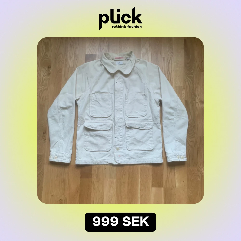 Säljer en stilren vit jacka från Apolis i storlek M. Jackan har långa ärmar och flera praktiska fickor framtill. Perfekt för vår och höst med sin klassiska design och bekväma passform. Passar både till vardags och lite finare tillfällen.