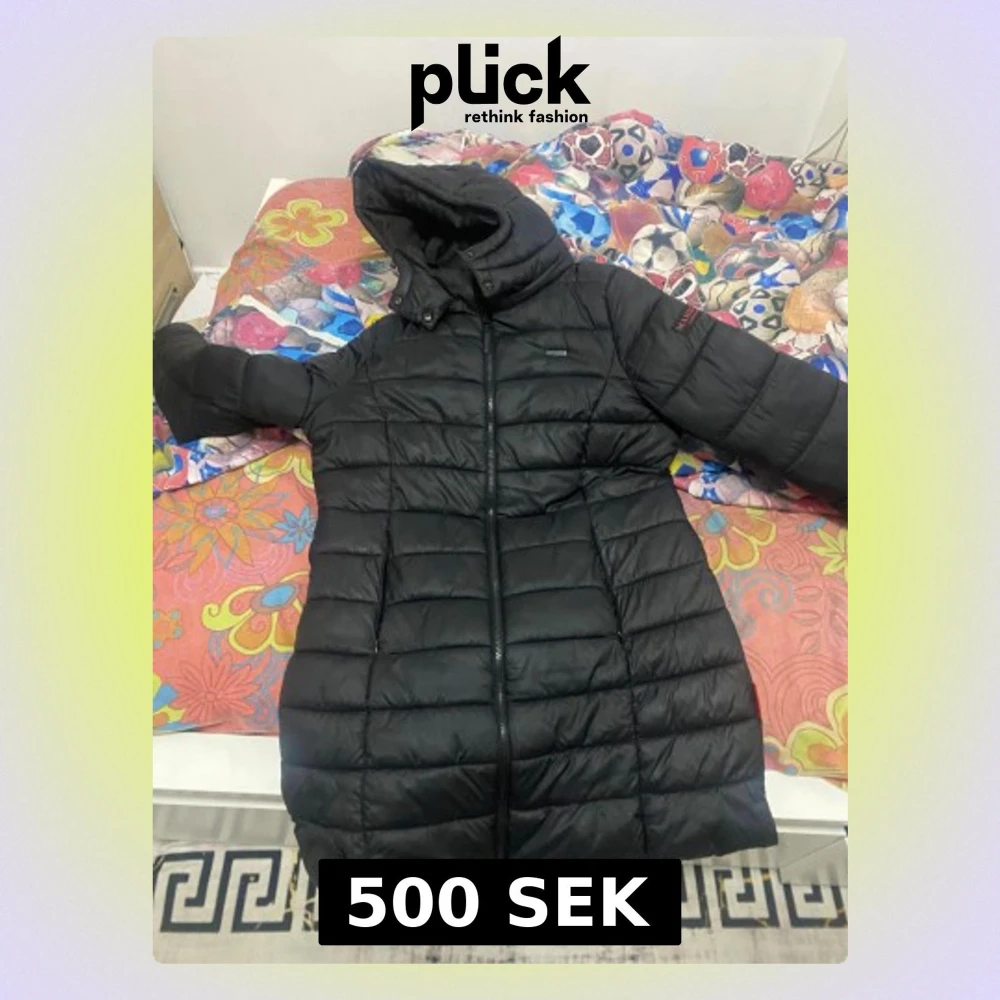 Säljer en svart lång dunjacka från Marikoo med quiltad design och huva. Jackan har dragkedja framtill och är helsvart med diskreta logodetaljer. Perfekt för kalla dagar när du vill hålla dig varm och snygg. För 500 men vi kan diskutera priset