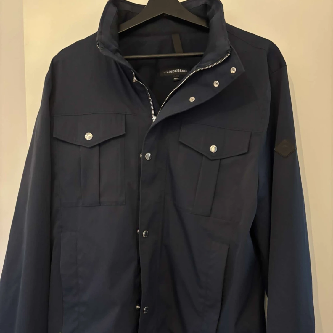 Snygg marin blå jacka från J.Lindeberg med dragkedja och knappar framtill. Jackan har två bröstfickor med lock och knappar samt en hög krage. Perfekt för en stilren look.