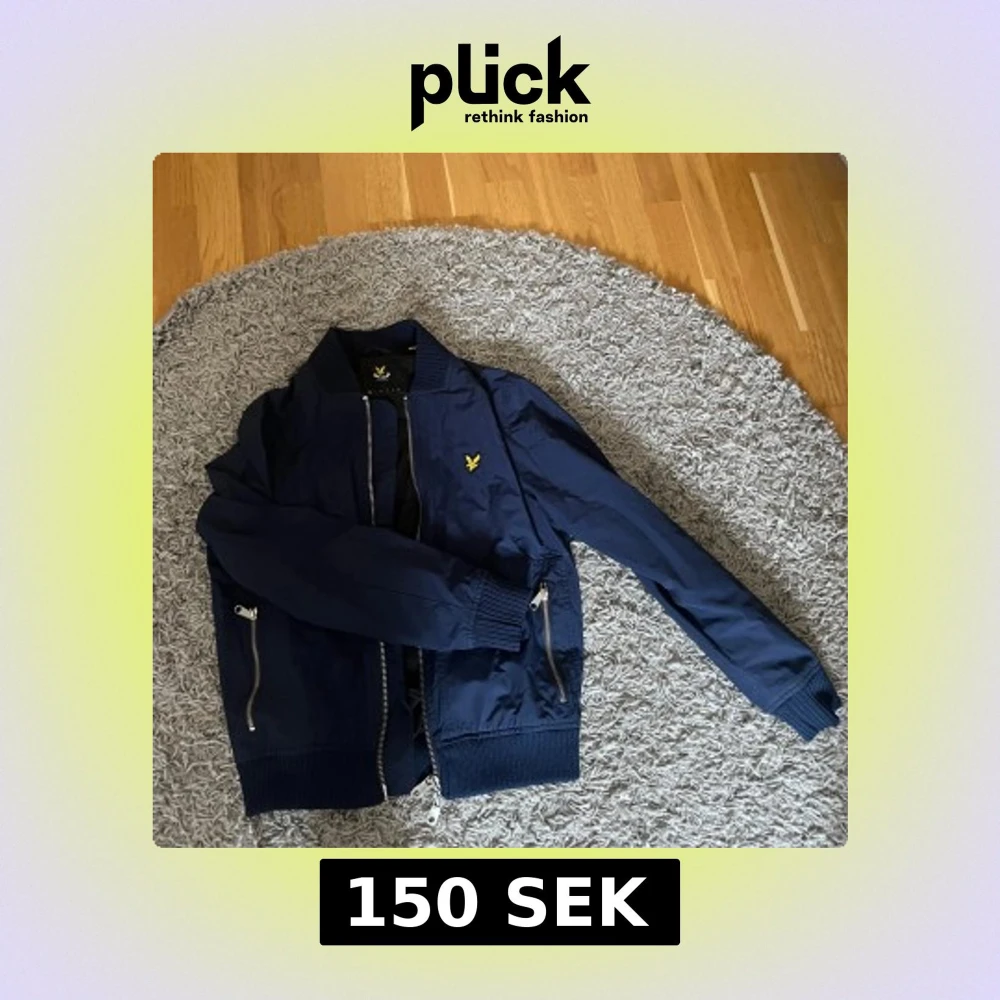 Säljer en marinblå bomberjacka från Lyle & Scott med gul logga på bröstet. Jackan har dragkedja framtill, ribbade muddar och två fickor med dragkedja. Perfekt för dig som vill ha en stilren och klassisk look.
