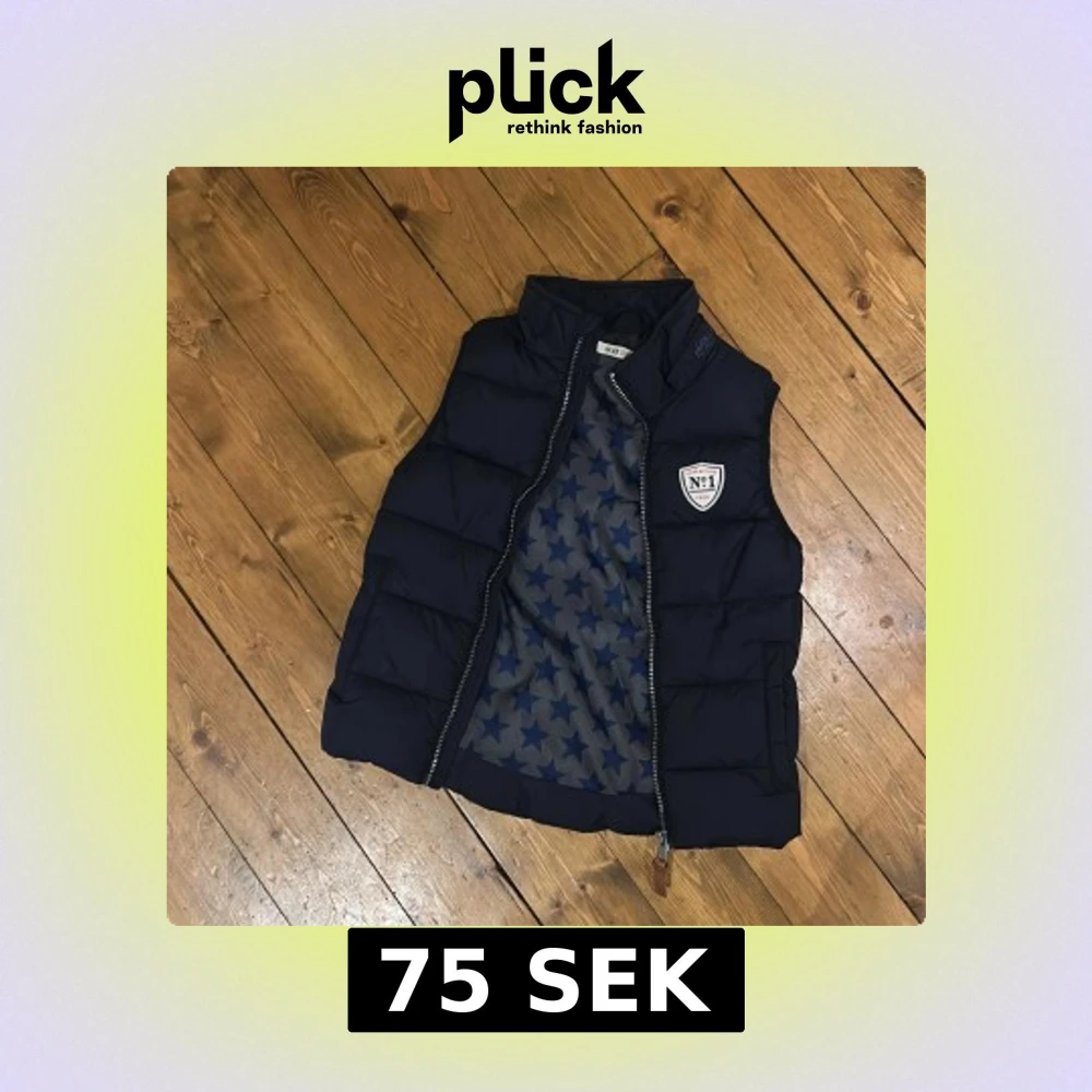 Snygg marinblå dunväst från H&M med quiltad design och dragkedja framtill. Insidan har ett coolt stjärnmönster i blått och grått. På bröstet sitter en patch med texten 'No 1'. Perfekt för lager-på-lager och streetstyle.