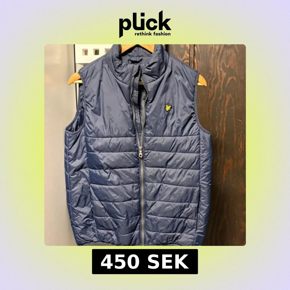 Snygg marinblå dunväst från Lyle & Scott Junior med gul logga på bröstet som knappt är använd.. Västen har quiltad design, hög krage och dragkedja framtill. Perfekt att slänga över en hoodie när det är lite kyligt ute. Materialet är polyester och västen har en normal passform.