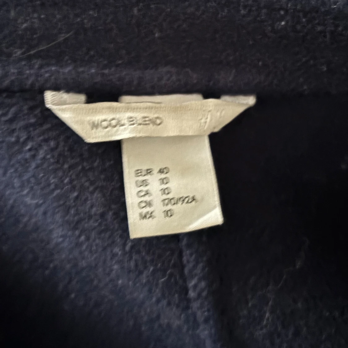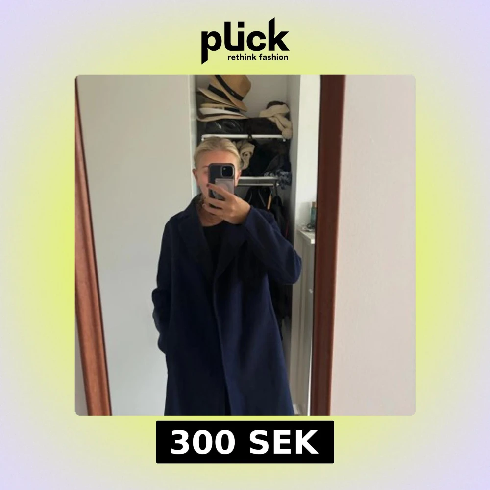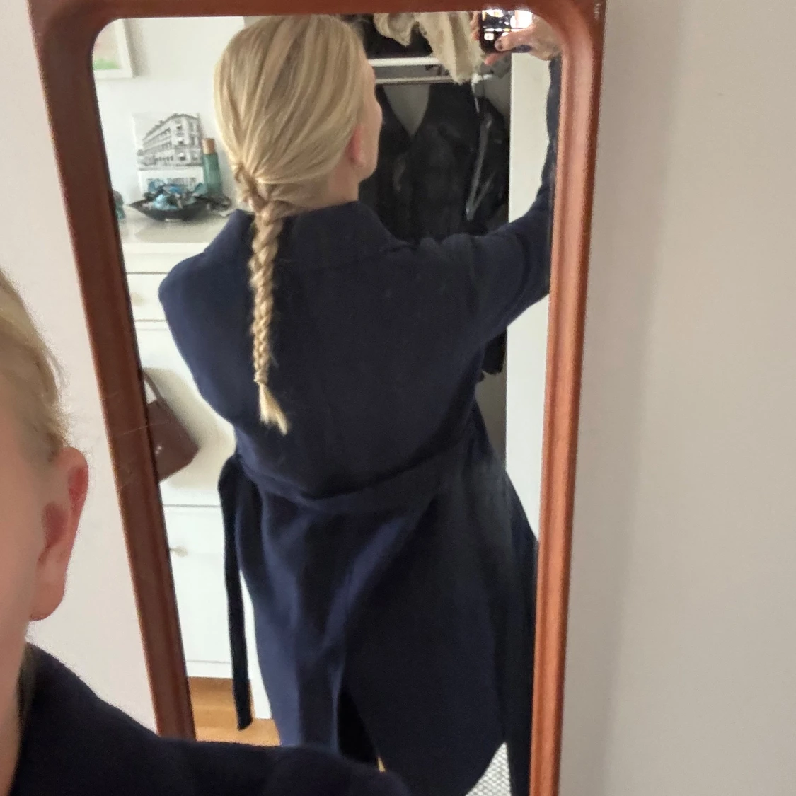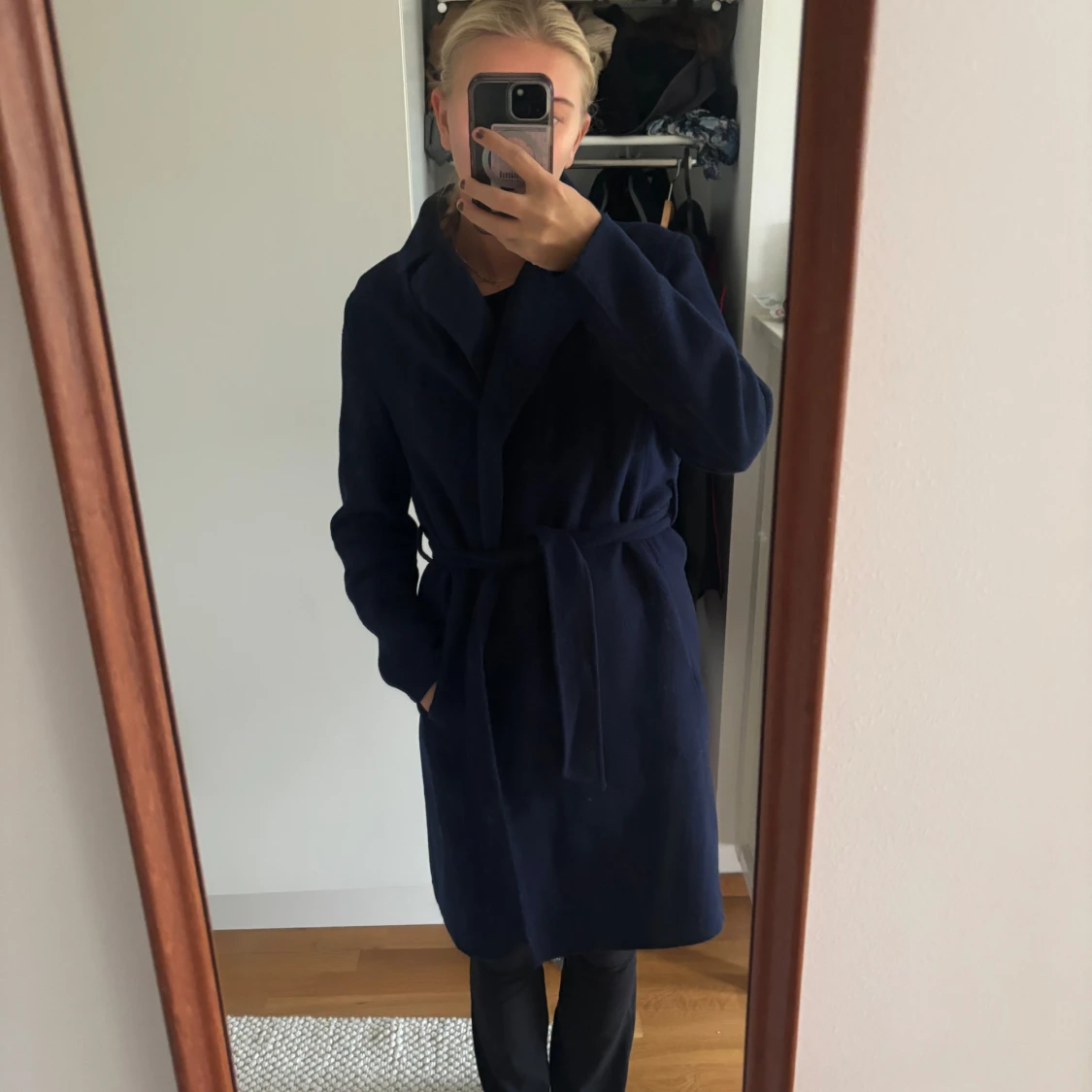 Säljer en stilren mörkblå kappa i ullmix med skärp i midjan och klassisk krage. De är storlek 40 men är liten i storleken!