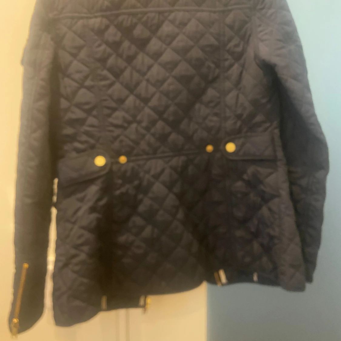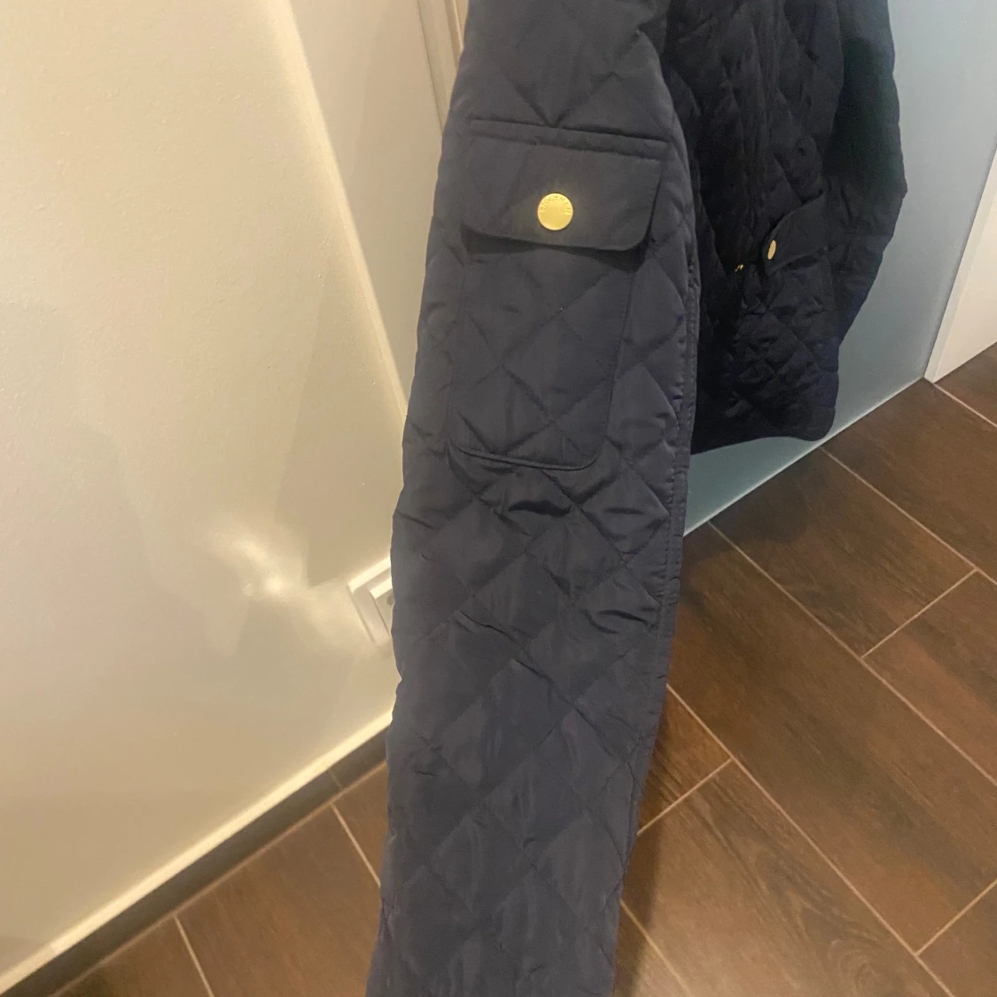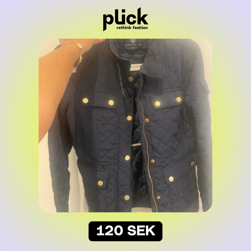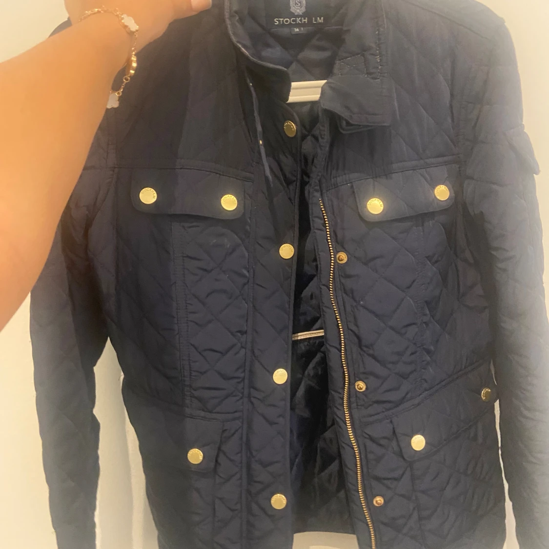 Säljer en snygg mörkblå quiltad jacka från Stockh LM. Jackan har en dragkedja framtill och flera guldknappar som detaljer. Den har långa ärmar och fyra fickor med knappar på framsidan. Perfekt för höst och vår!