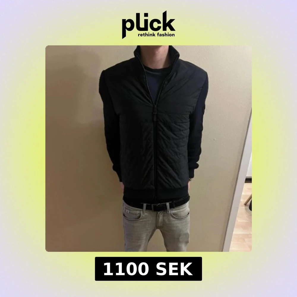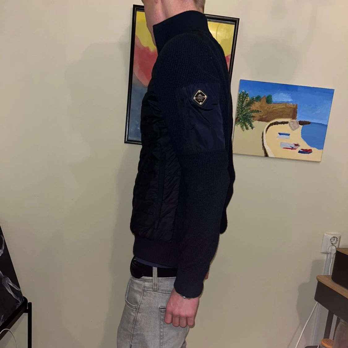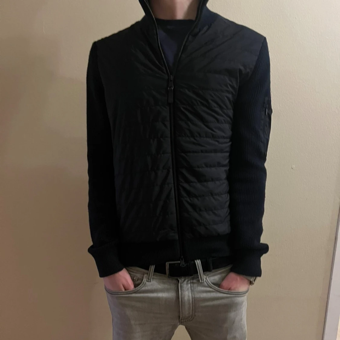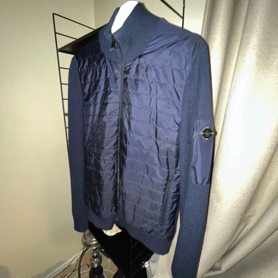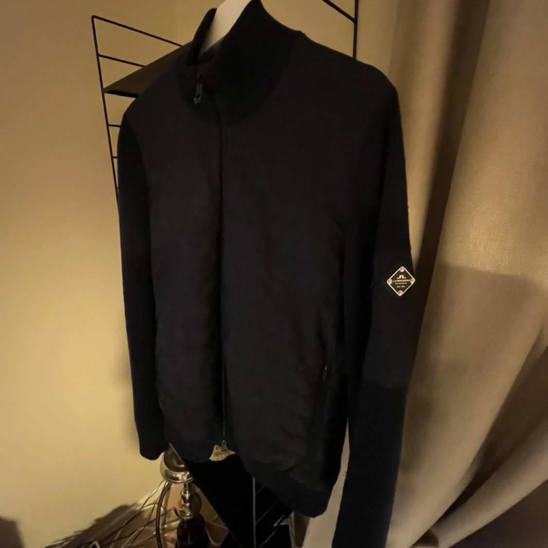 Marinblå cardigan jacka från J.Lindeberg med quiltad front och stickade ärmar. Jackan har hög krage, dragkedja hela vägen och en snygg patch på ärmen. Perfekt för dig som gillar stilren design och vill ha något som funkar till många outfits.