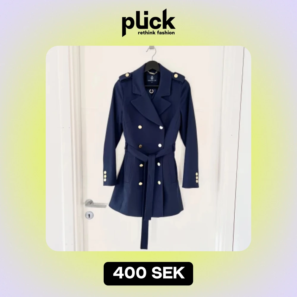 Säljer en elegant mörkblå kappa från Stockh lm i storlek 36. Den har en klassisk dubbelknäppt design med guldknappar och ett matchande bälte i midjan för en snygg passform. Kappan är tillverkad i en blandning av polyester och viskos, vilket ger en skön och hållbar känsla. Perfekt för höst och vår!