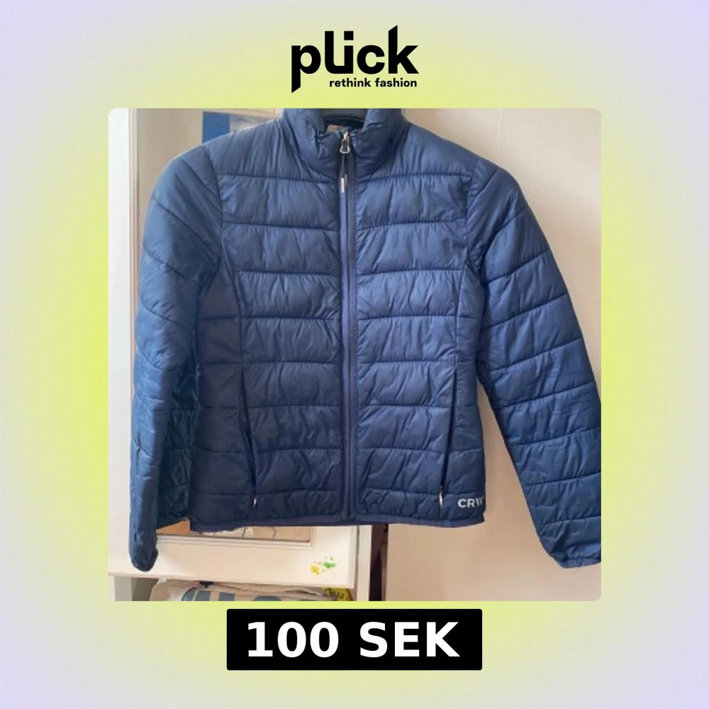 Säljer en marinblå pufferjacka från CRW med quiltad design och dragkedja framtill. Jackan har hög krage och två fickor med dragkedja. Perfekt för kyliga dagar och enkel att matcha med olika outfits.