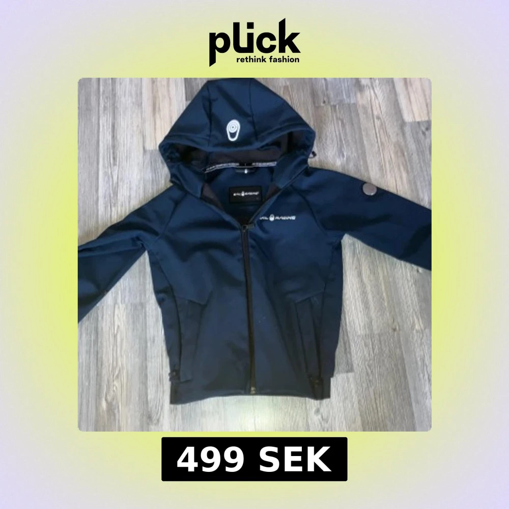 Säljer en marinblå softshelljacka från Sail Racing med huva och hel dragkedja. Jackan har två sidofickor med dragkedja och en logotyp på bröstet. Perfekt för blåsiga dagar och snygg till vardags.