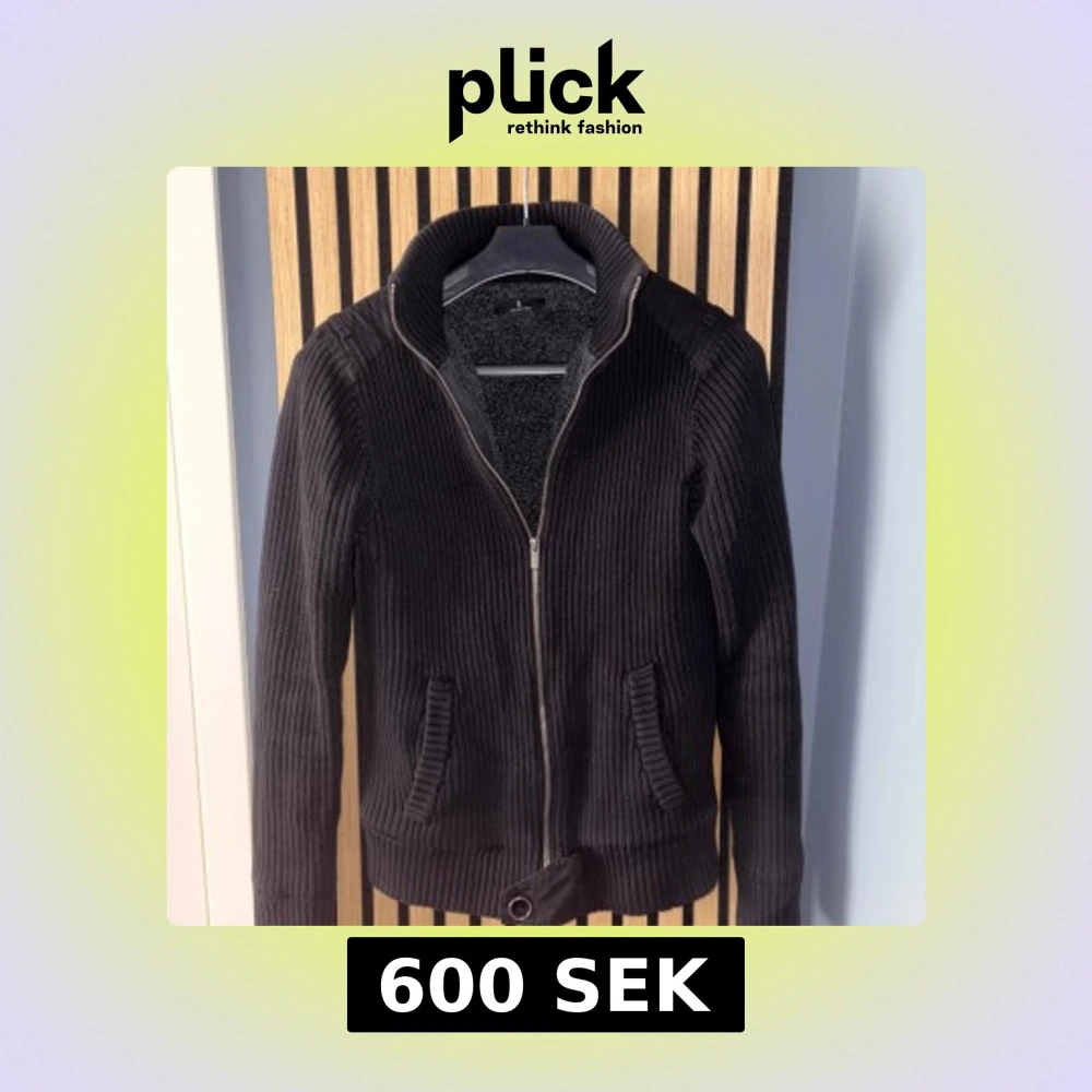 Säljer en marinblå stickad jacka från Selected med dragkedja och mysigt teddyfoder på insidan. Jackan har ribbade detaljer, hög krage och två fickor framtill. Perfekt för kyliga dagar.