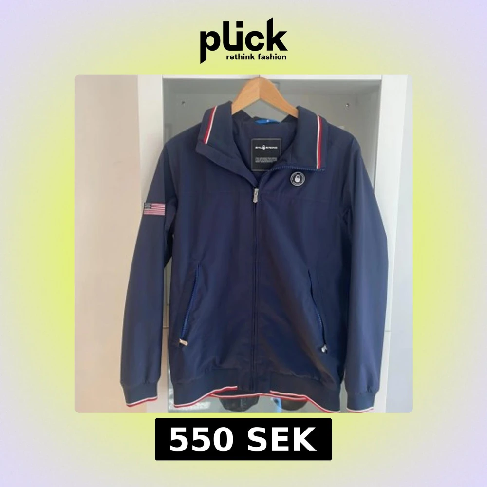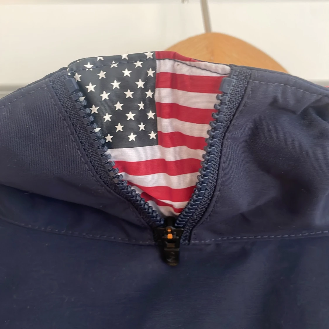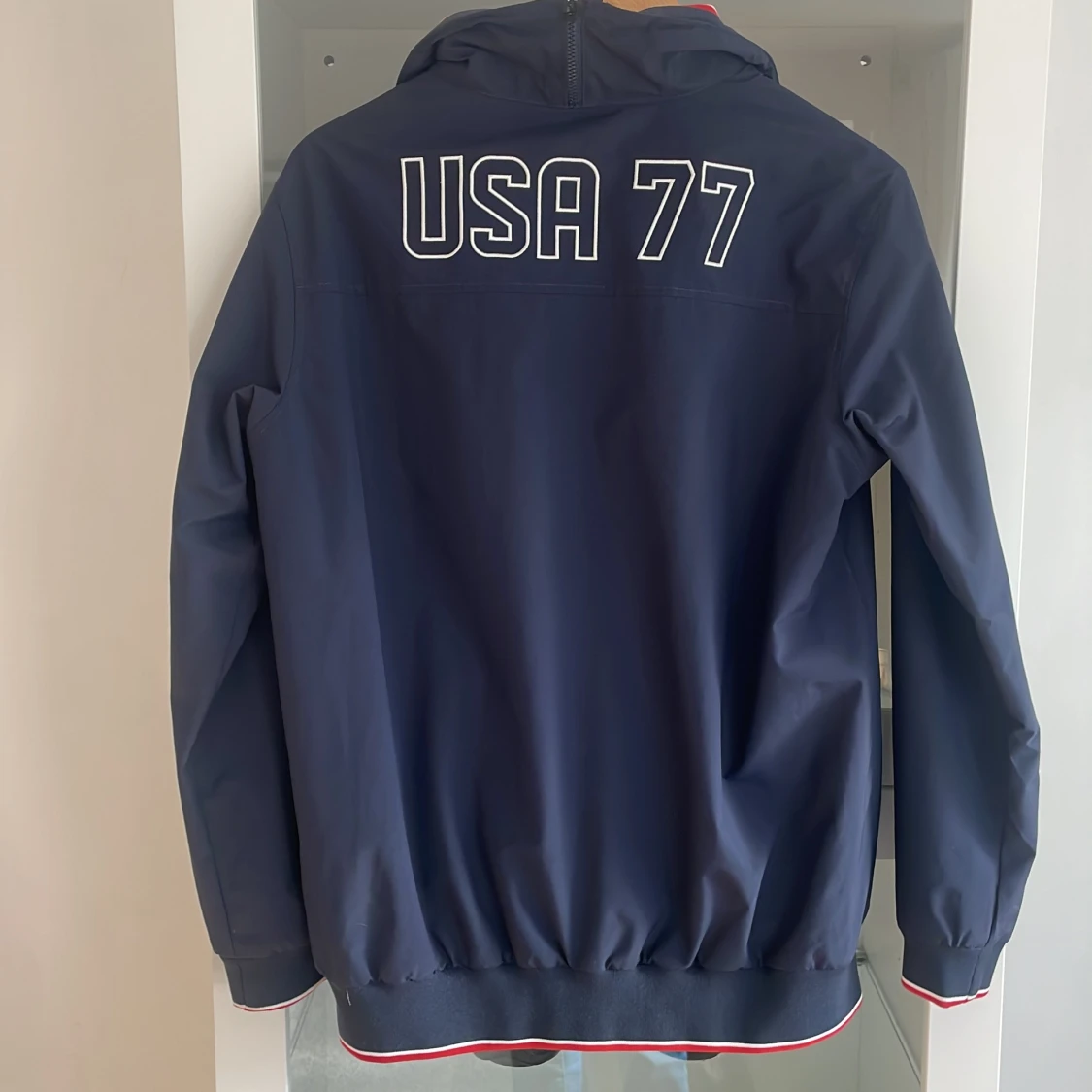 Snygg marinblå vindjacka från Sail Racing med dragkedja, USA-flagga på ärmen och trycket 'USA 77' på ryggen. Fodret i luvan har amerikanskt flaggmönster och jackan har röda och vita detaljer vid krage och muddar.
