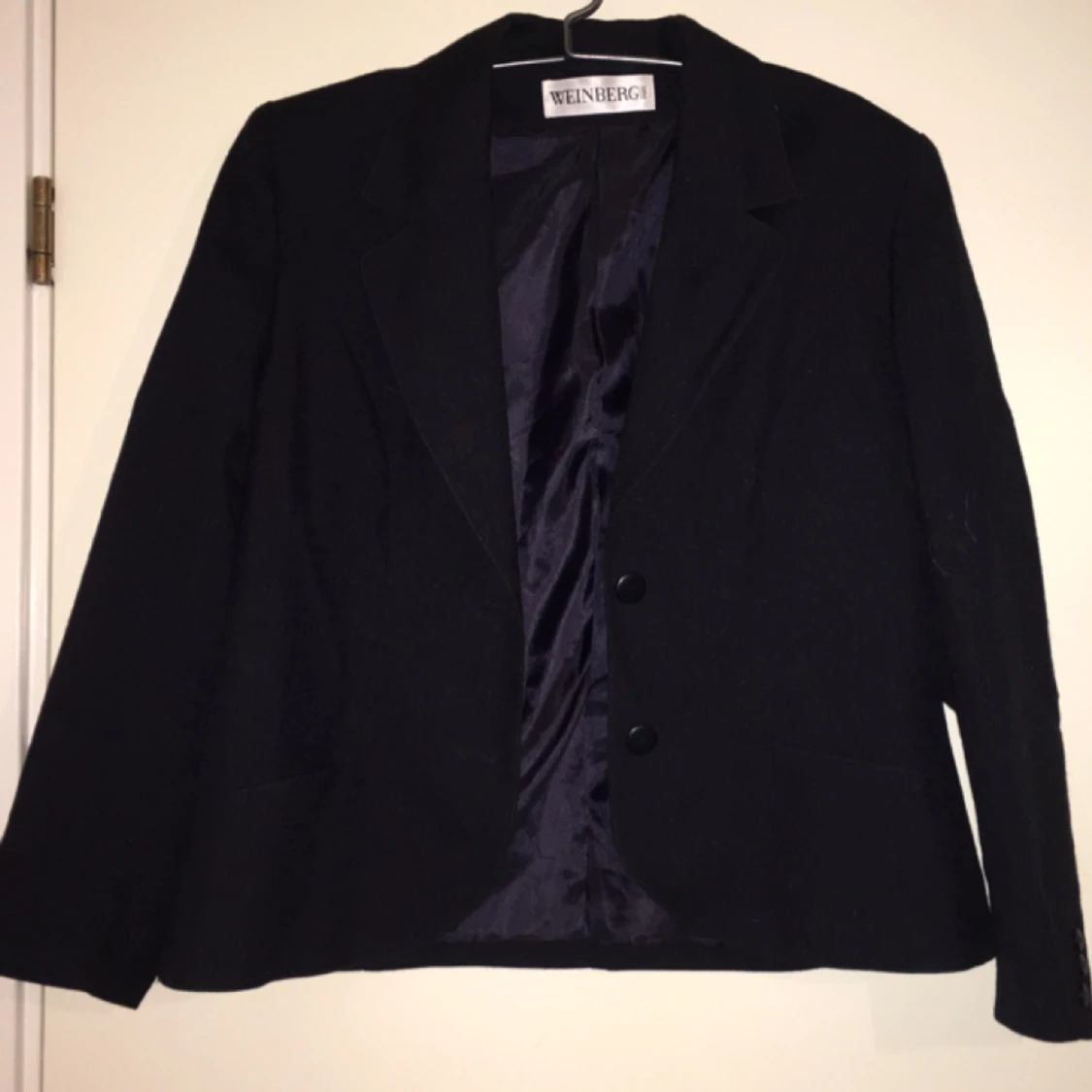 Kavaj med axelvaddar för att ge mer struktur. Tyget är strävt, liknar linnetyg fast inte riktigt och är i färgen svart/marinblått