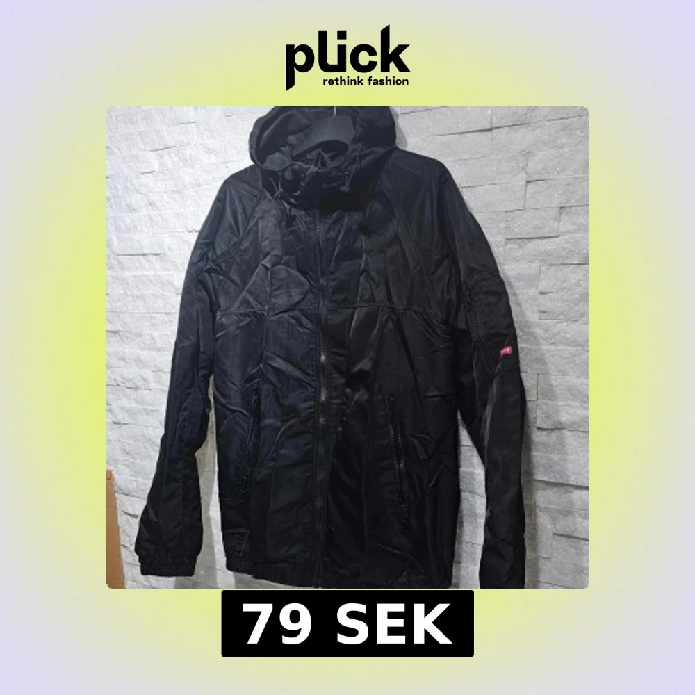 Säljer en svart vindjacka från VLNT med dragkedja och huva. Jackan har långa ärmar och elastiska muddar för extra komfort. Perfekt för blåsiga dagar.