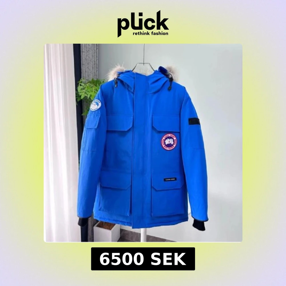 Snygg blå parkajacka från Canada Goose med pälsdetaljer på huvan. Jackan har flera praktiska fickor och en robust dragkedja. Perfekt för kalla dagar.