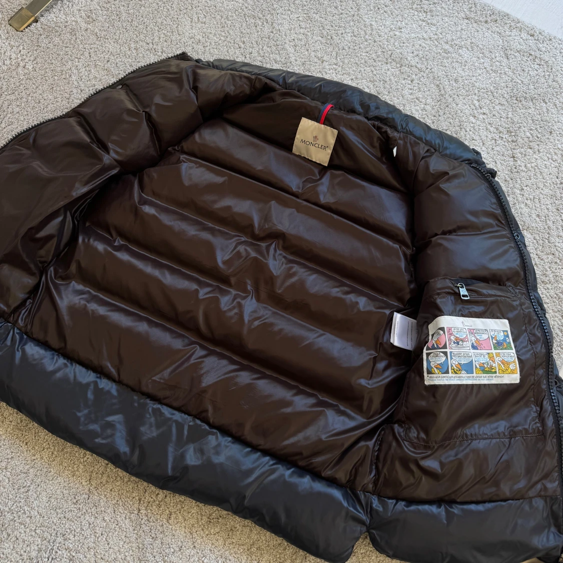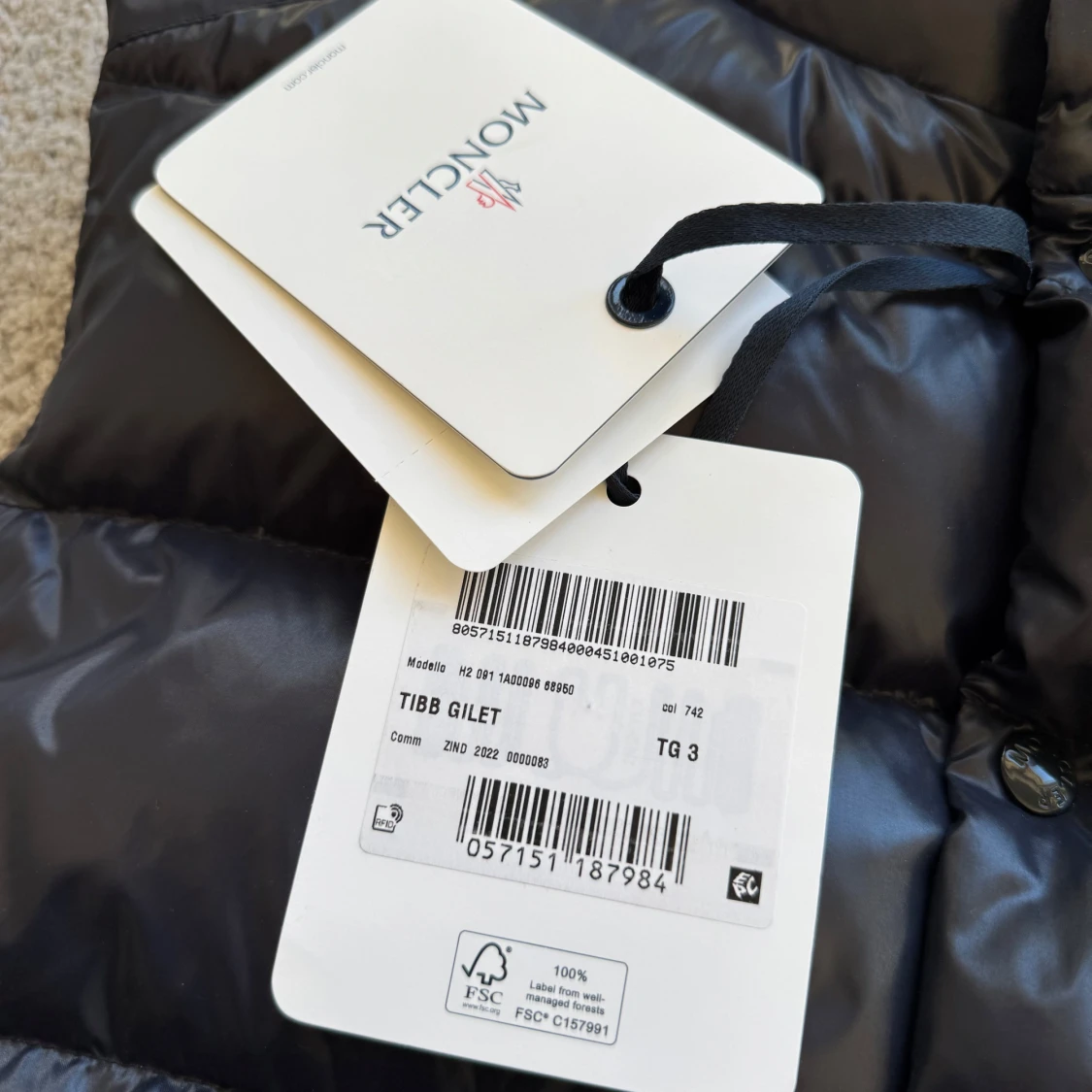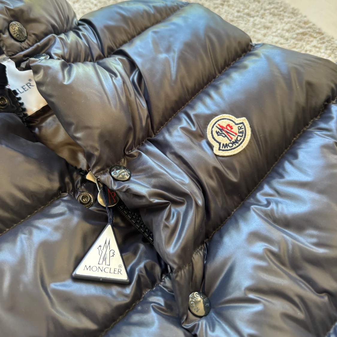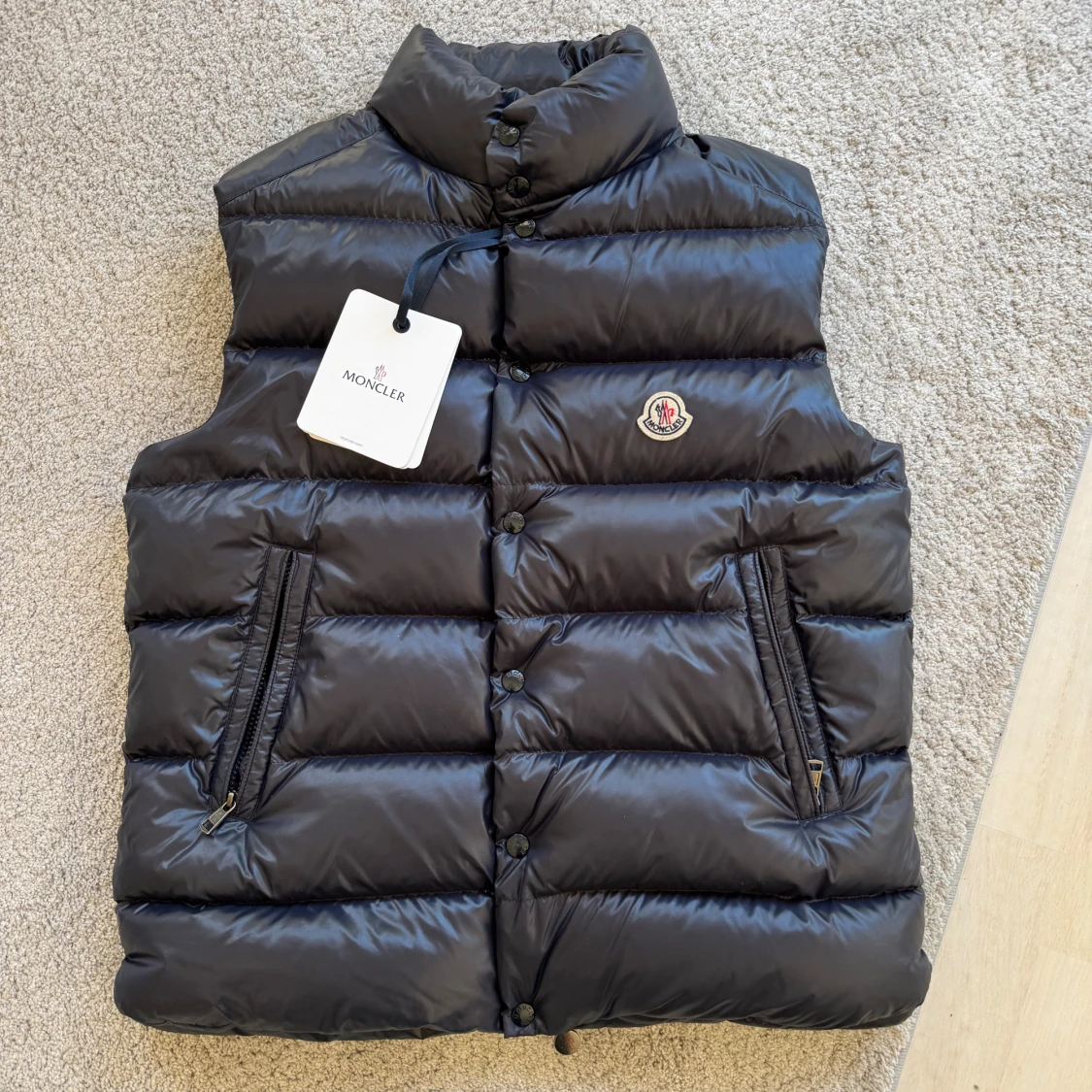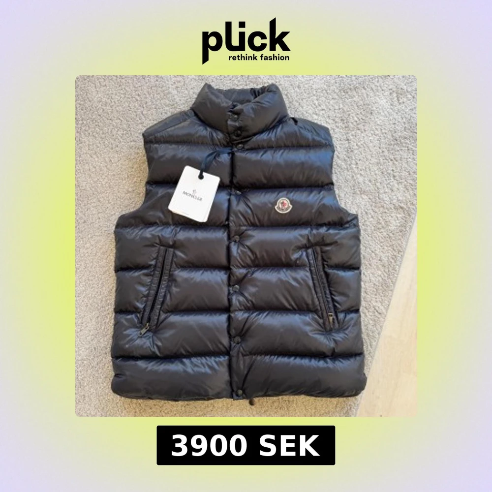 Snygg marinblå dunväst från Moncler med krage och klassisk logga på bröstet. Västen har dragkedjefickor och knappar framtill.