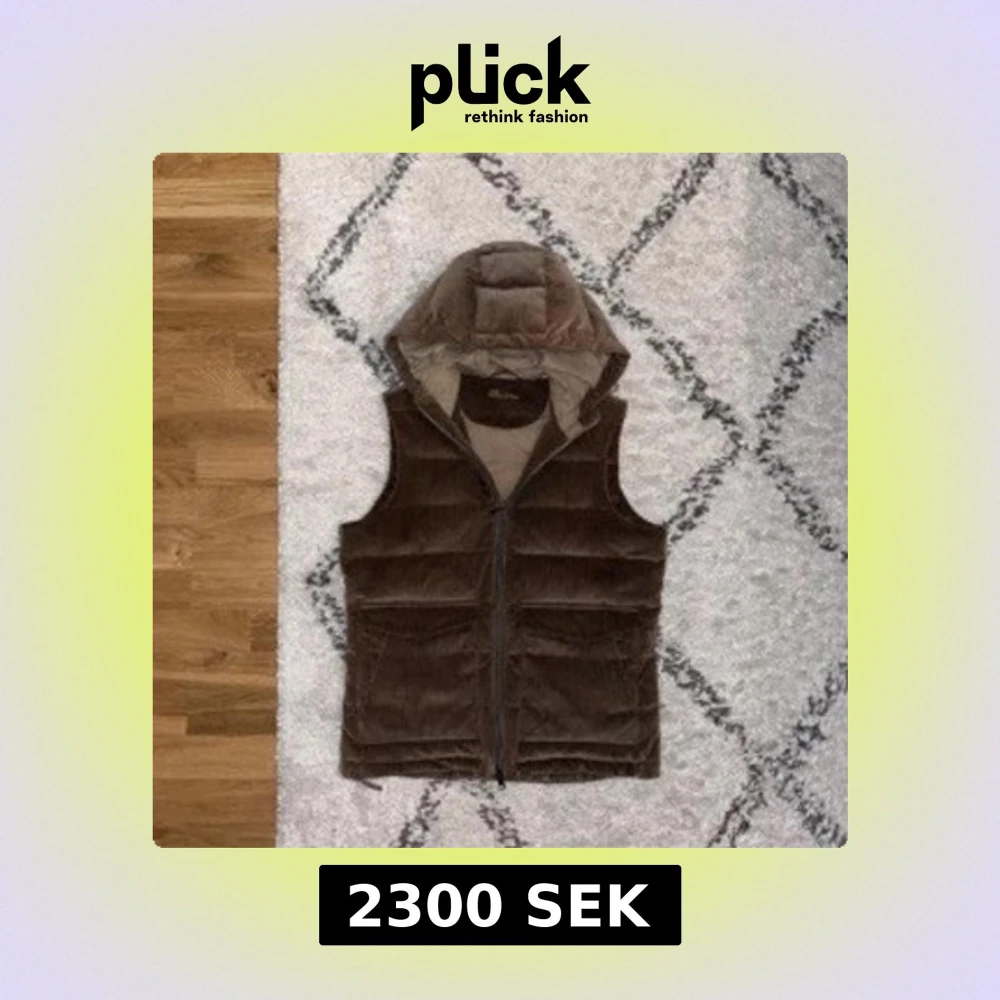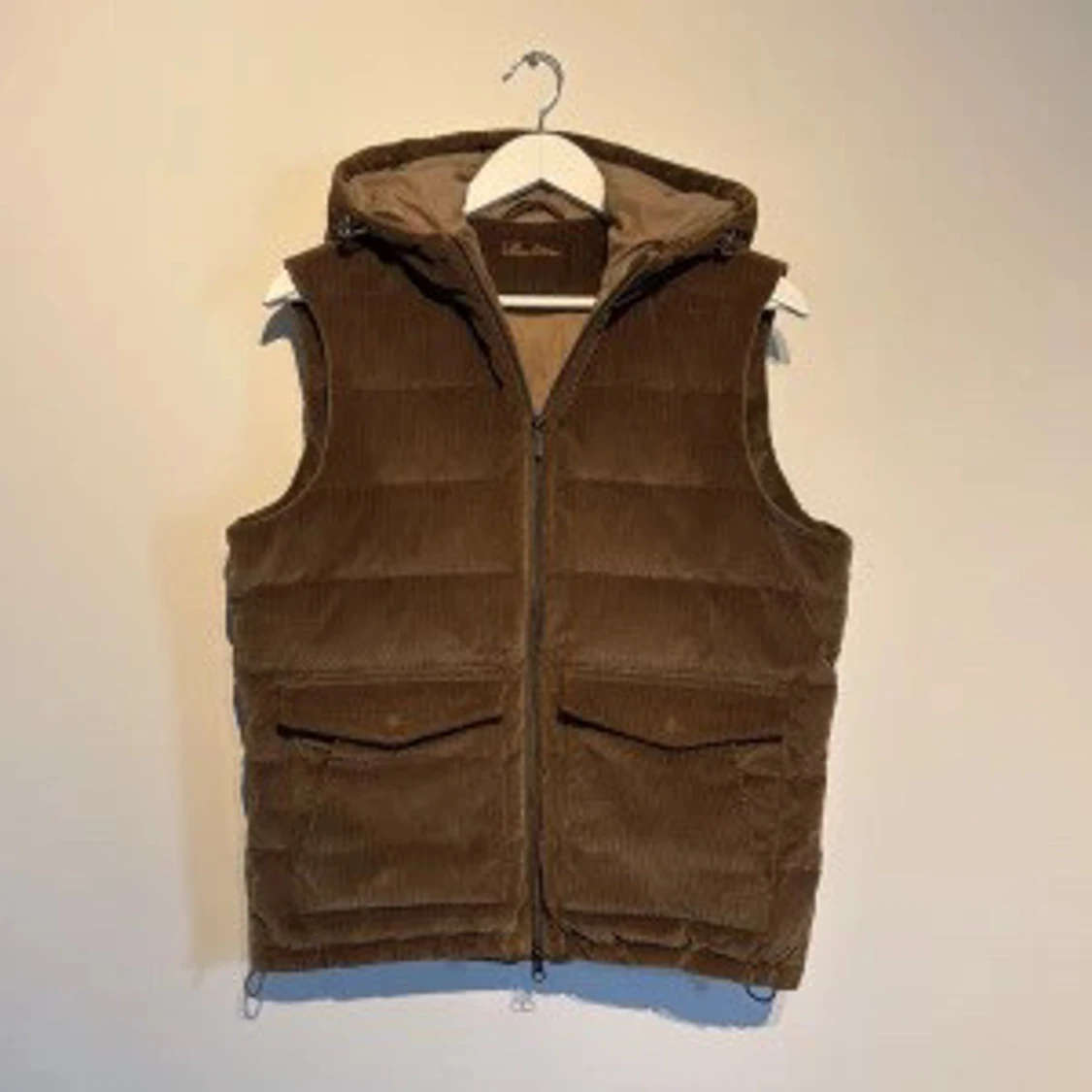 Snygg brun dunväst från Blauer i manchestertyg med horisontella quiltade paneler och praktisk huva. Västen har två stora fickor med lock framtill och stängs med dragkedja. Perfekt för lager-på-lager och chill stil.