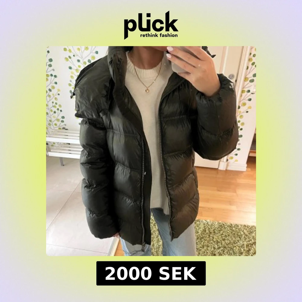 Säljer en mörkgrön massimo dutti jacka med stor, mysig huva och dragkedja framtill. Materialet är glansigt och känns riktigt skönt.