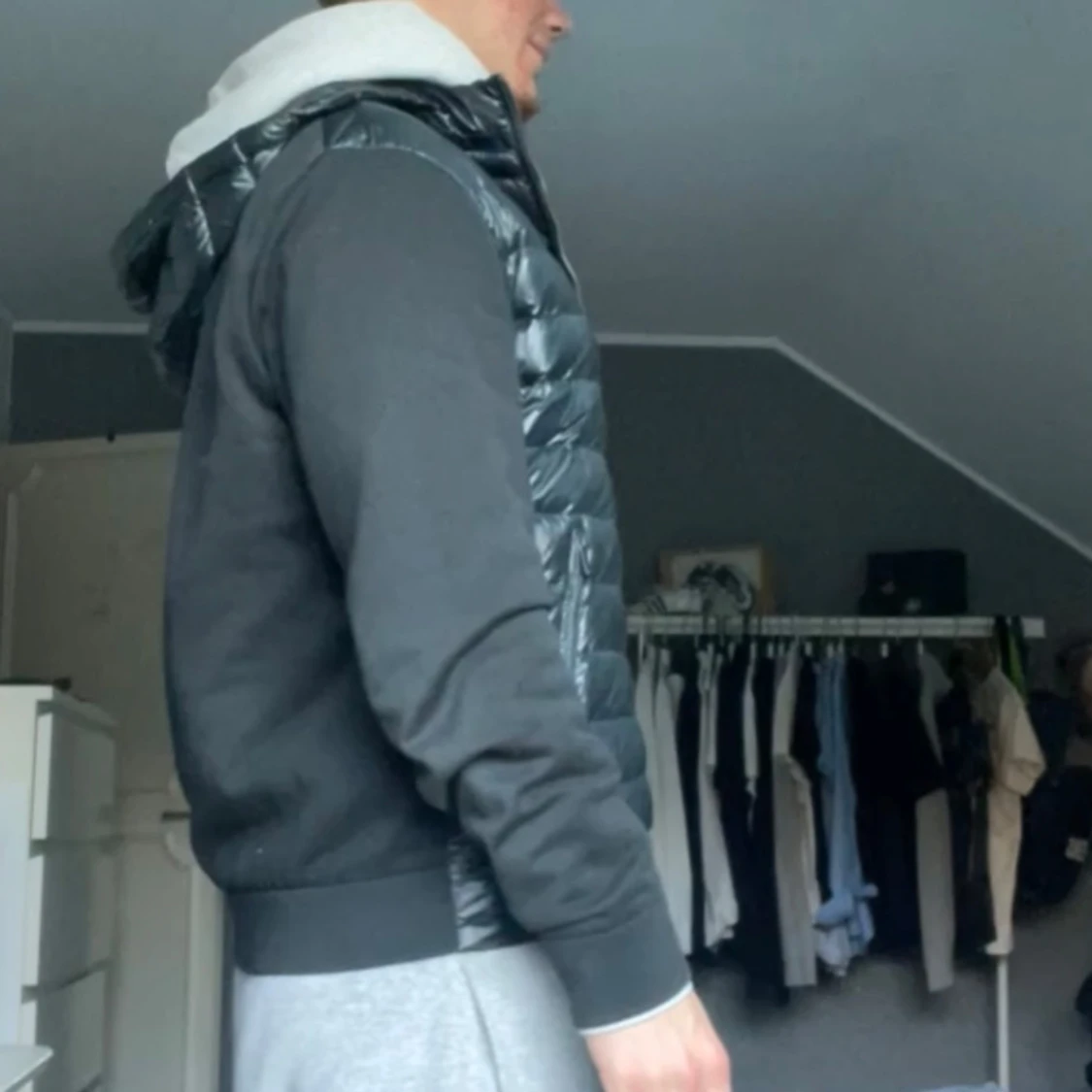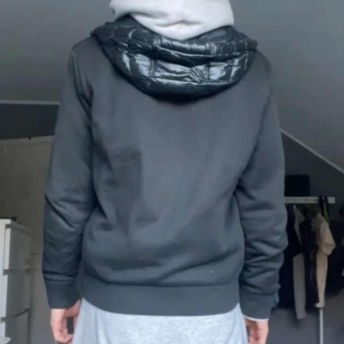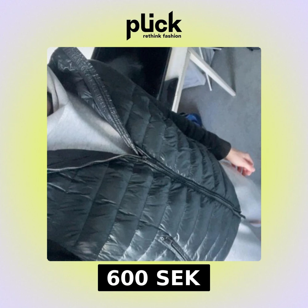 Snygg svart dunväst med quiltad design och dragkedja framtill. Västen har en praktisk huva och en stilren, mörk look som passar perfekt över en hoodie. Materialet är glansigt och ger en modern vibe. Perfekt för dig som gillar streetwear och vill hålla värmen.
