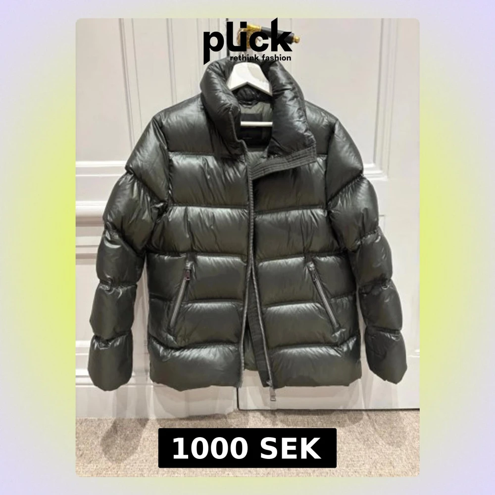 Säljer en riktigt snygg mörkgrön pufferjacka med hög krage och två snedställda fickor med dragkedja. Jackan har en glansig finish och breda, quiltade partier som ger en cool och modern look. Perfekt för kalla dagar när du vill hålla stilen.
