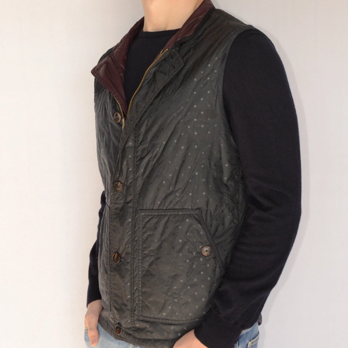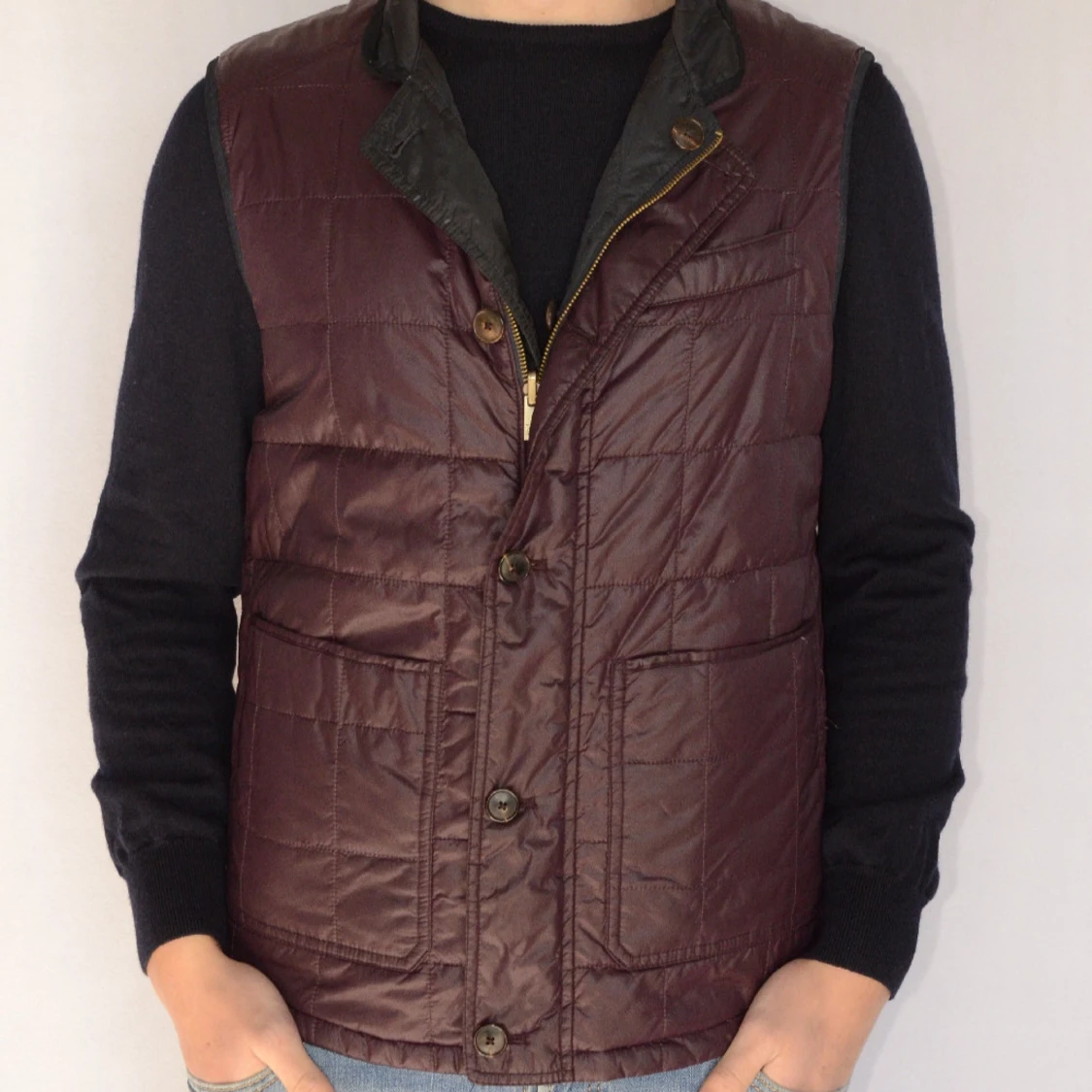 MASSIMO DUTTI VÄNDBAR DUNVÄST Storlek : M Passform : Normal Användning : Västen är i ett väldigt fint skick utan defekter Nypris : Cirka 1500SEK Modellen på bilen är 182CM och väger 76KG