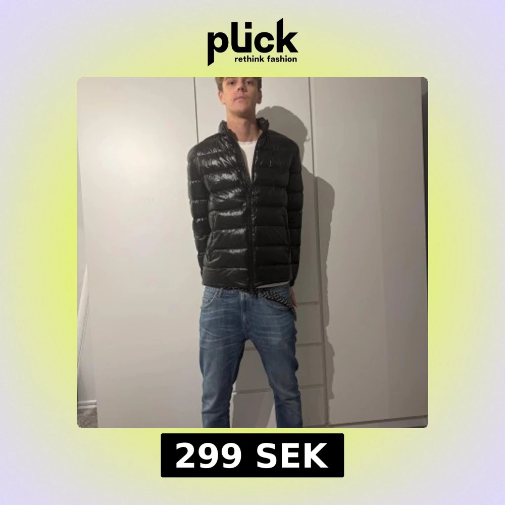 Säljer en svart, glansig pufferjacka med hög krage och hel dragkedja framtill. Jackan har en clean look med horisontella sömmar och sitter snyggt på kroppen. Perfekt för kyligare dagar och passar till det mesta. Köp nu så skickar jag idag, priset sänks till 150