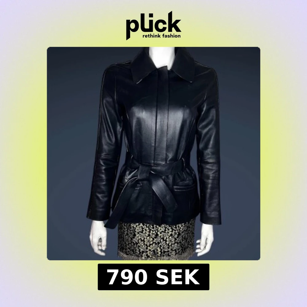 Snygg svart nappa skinnjacka med bälte i midjan för en stilren look. Jackan har långa ärmar och en klassisk krage. Perfekt för att ge en edgy touch till din outfit.