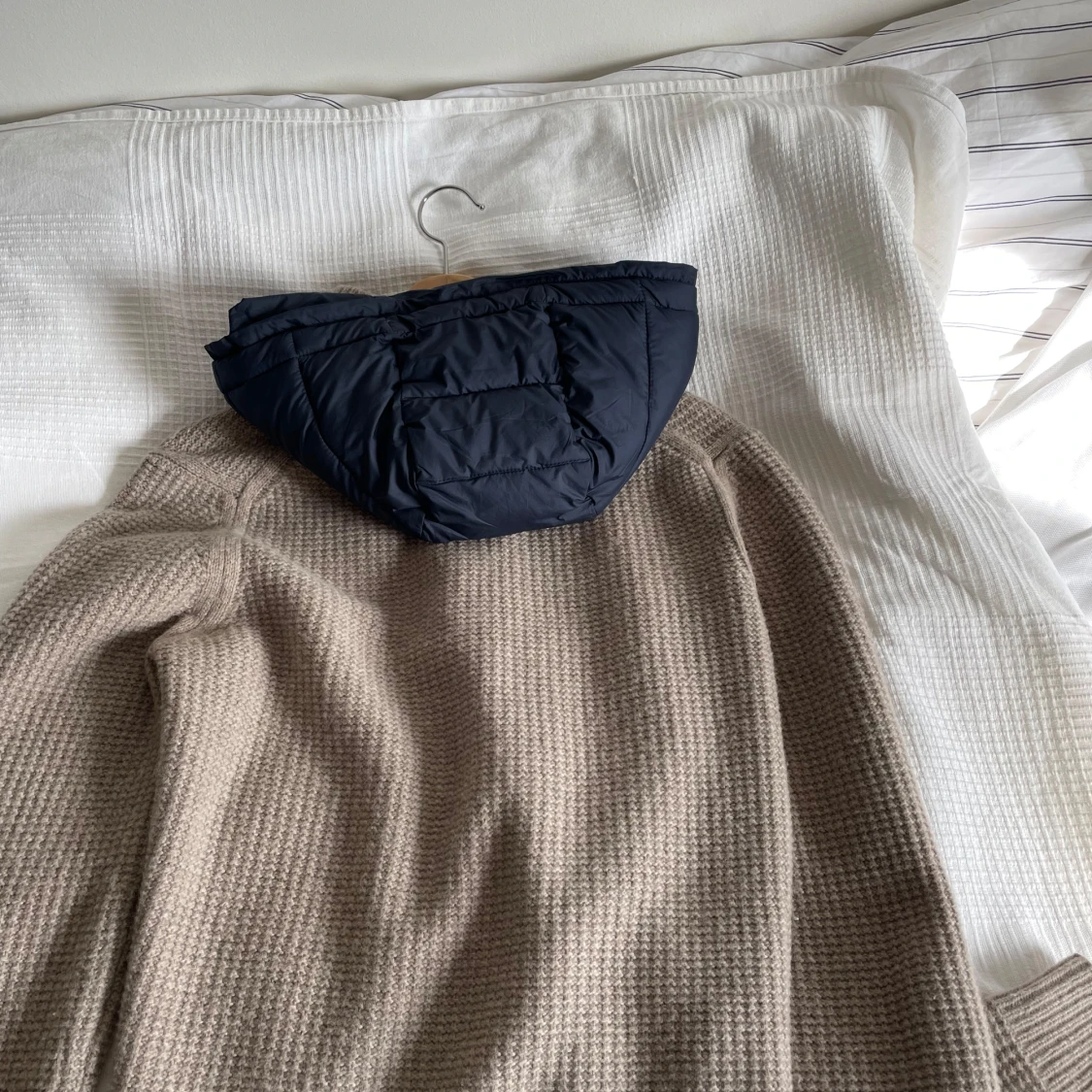 Säljer en snygg beige ulljacka från Massimo Dutti. Den har en quiltad huva i mörkblått och dragkedja framtill. Perfekt för höst och vinter med sin varma och stilrena design. Jackan är långärmad och i nyskick.