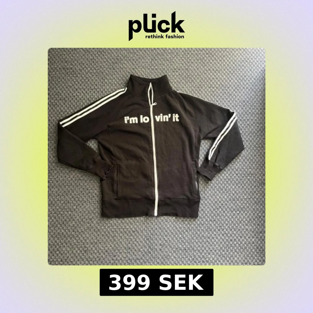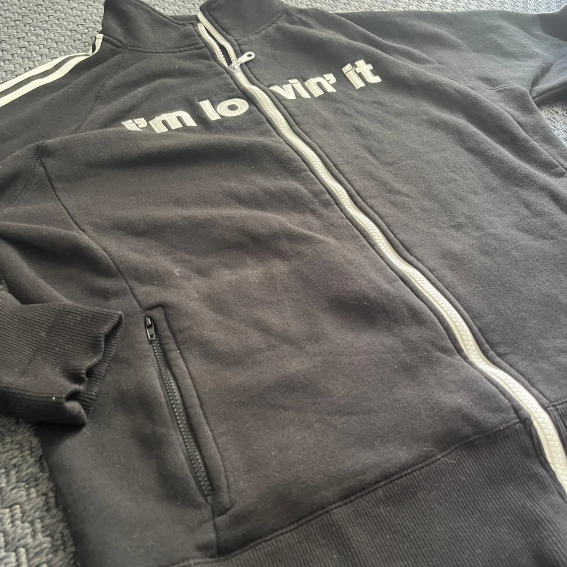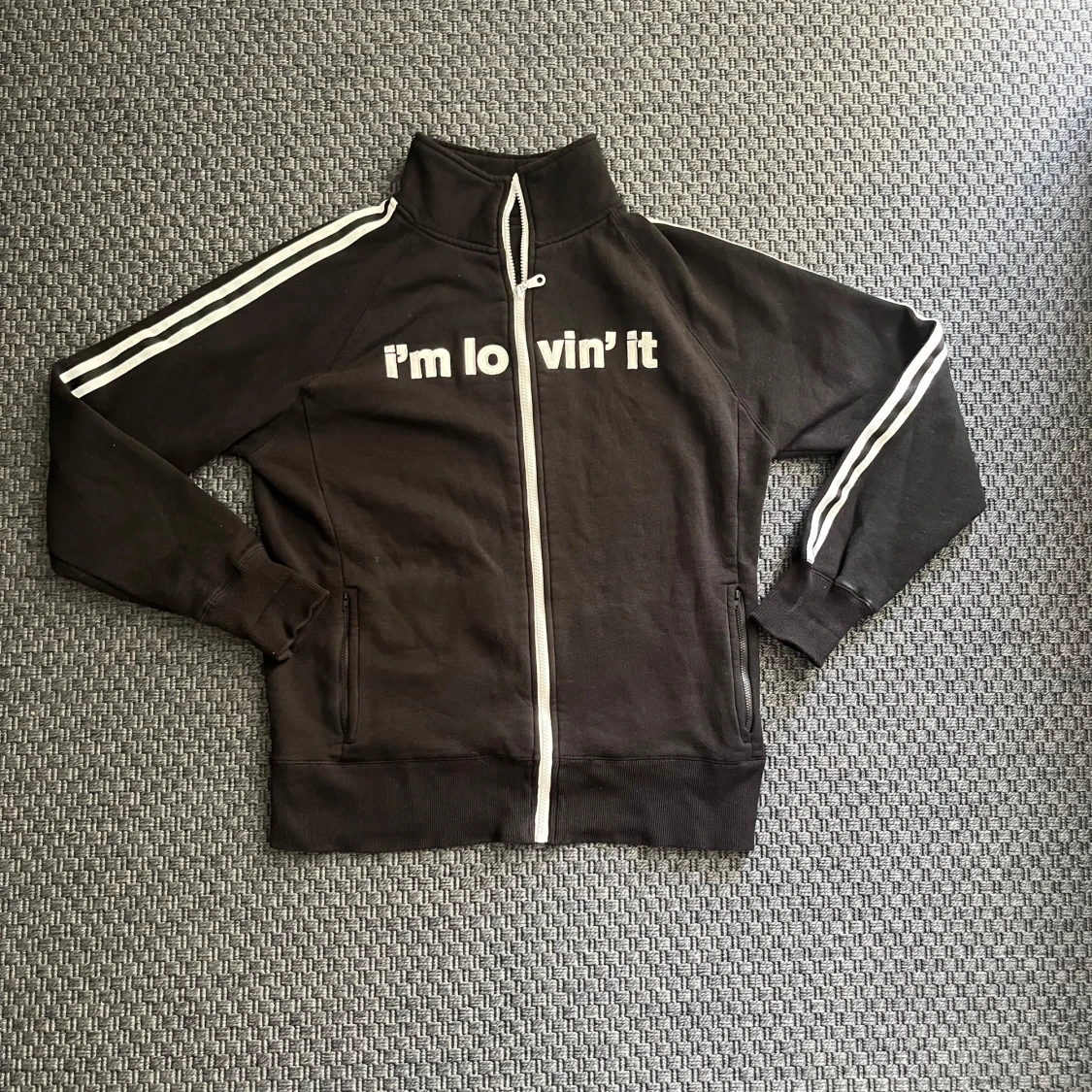 Svart track jacket med vit dragkedja och vita ränder längs ärmarna. Tryck med texten 'i'm lovin' it' på bröstet. Hög krage och två fickor med dragkedja. Tillverkad i bomullsmix, insida i mjuk fleece.