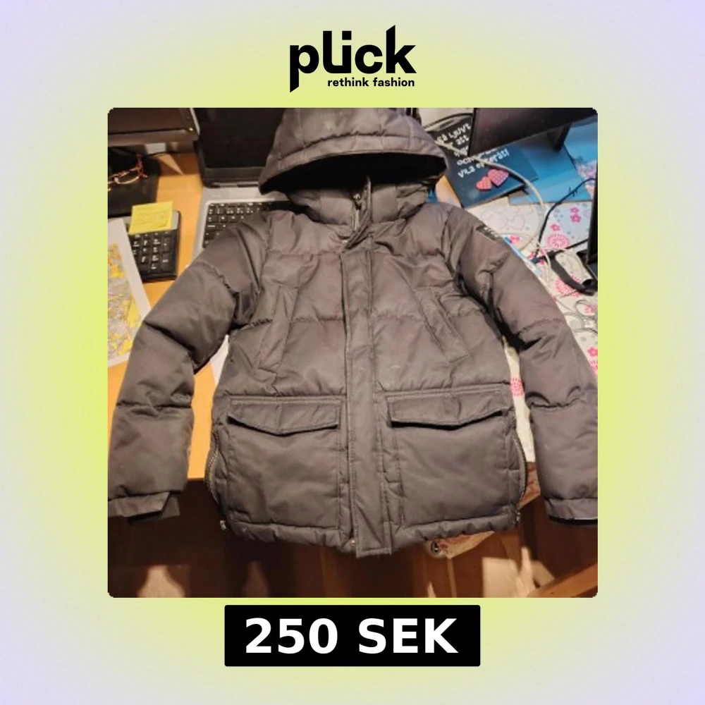 Svart pufferjacka från McKinley med huva och stora fickor framtill. Jackan har dragkedja, ribbade muddar och patch med logga på ärmen. Perfekt för kalla dagar och outdoor vibes. Jackan är nyskick förutom en fläck ovanför höger ficka. Se bilder.