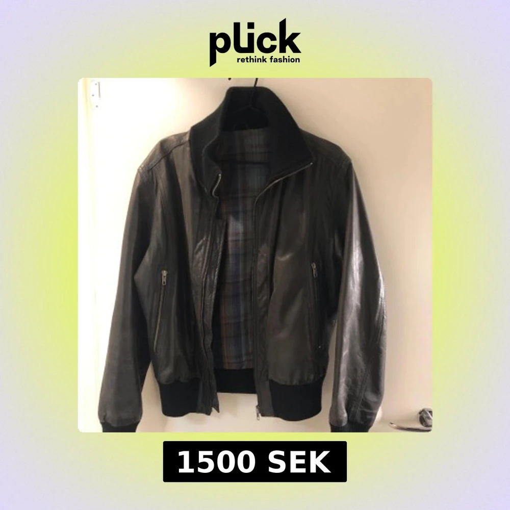 Snygg svart skinnjacka från Bruuns Bazaar med dragkedja och ribbade muddar. Jackan har en klassisk design med en rutig insida i blå och bruna toner. Perfekt för en stilren look.