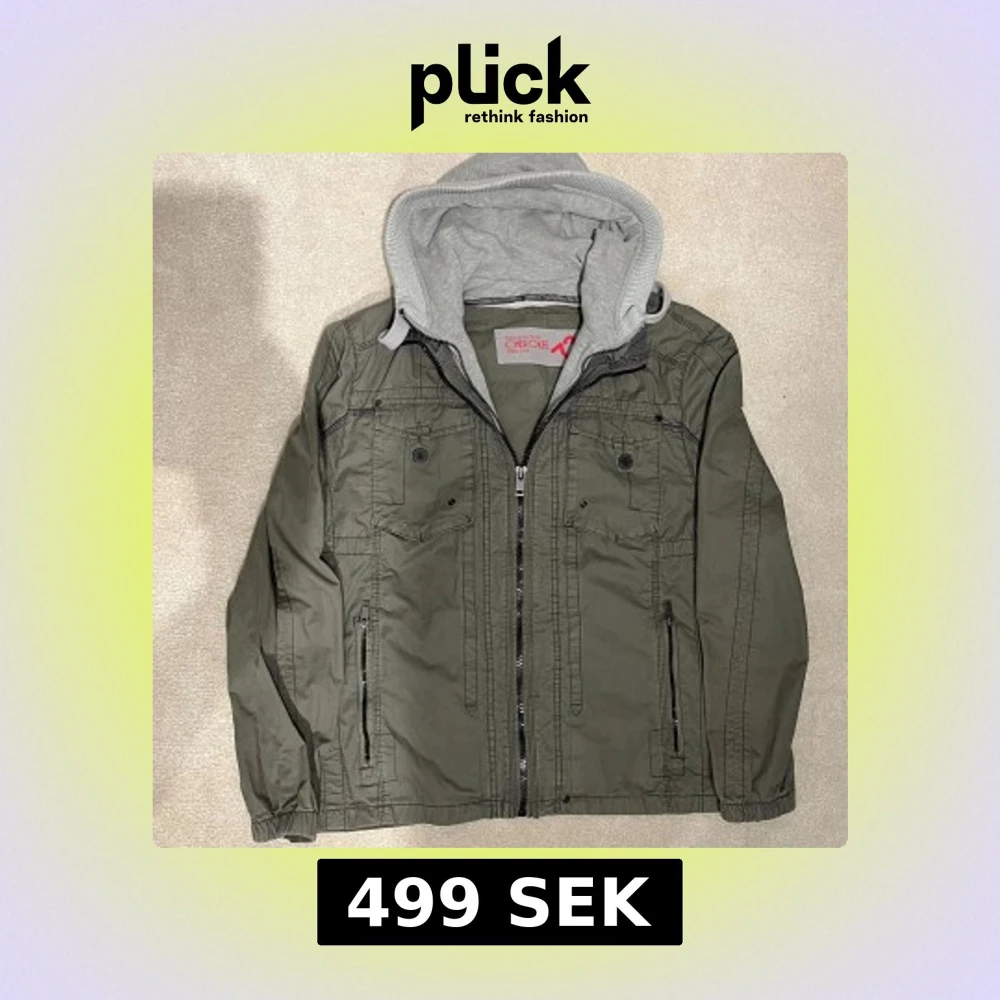 Snygg grön jacka med grå huva och dragkedja. Jackan har flera fickor med knappar och ribbade ärmslut. Perfekt för en casual look. Vid minsta fråga eller fundering hör av er🤝