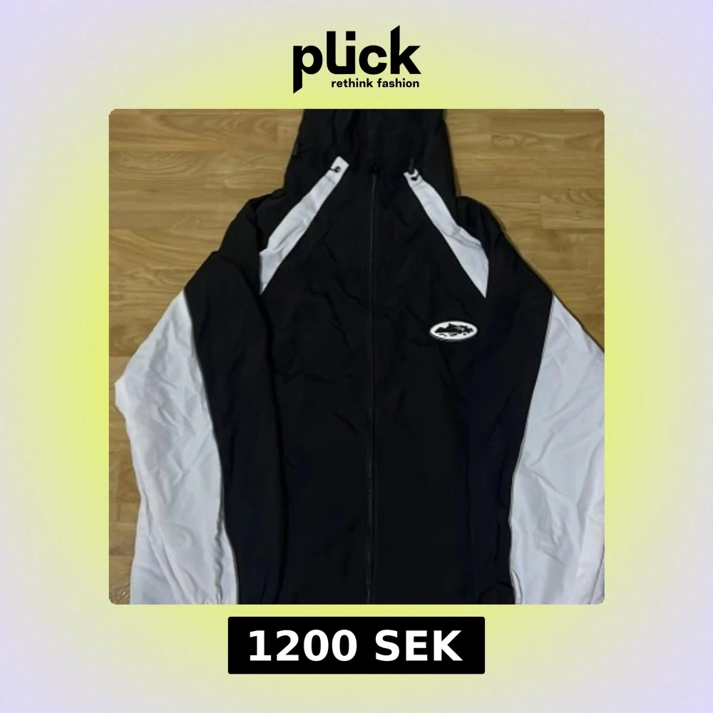 Säljer en stilren svart och vit vindjacka från Cortez med huva och dragkedja. Jackan har ett sportigt utseende med vita ärmar och en logotyp på bröstet. Perfekt för blåsiga dagar.