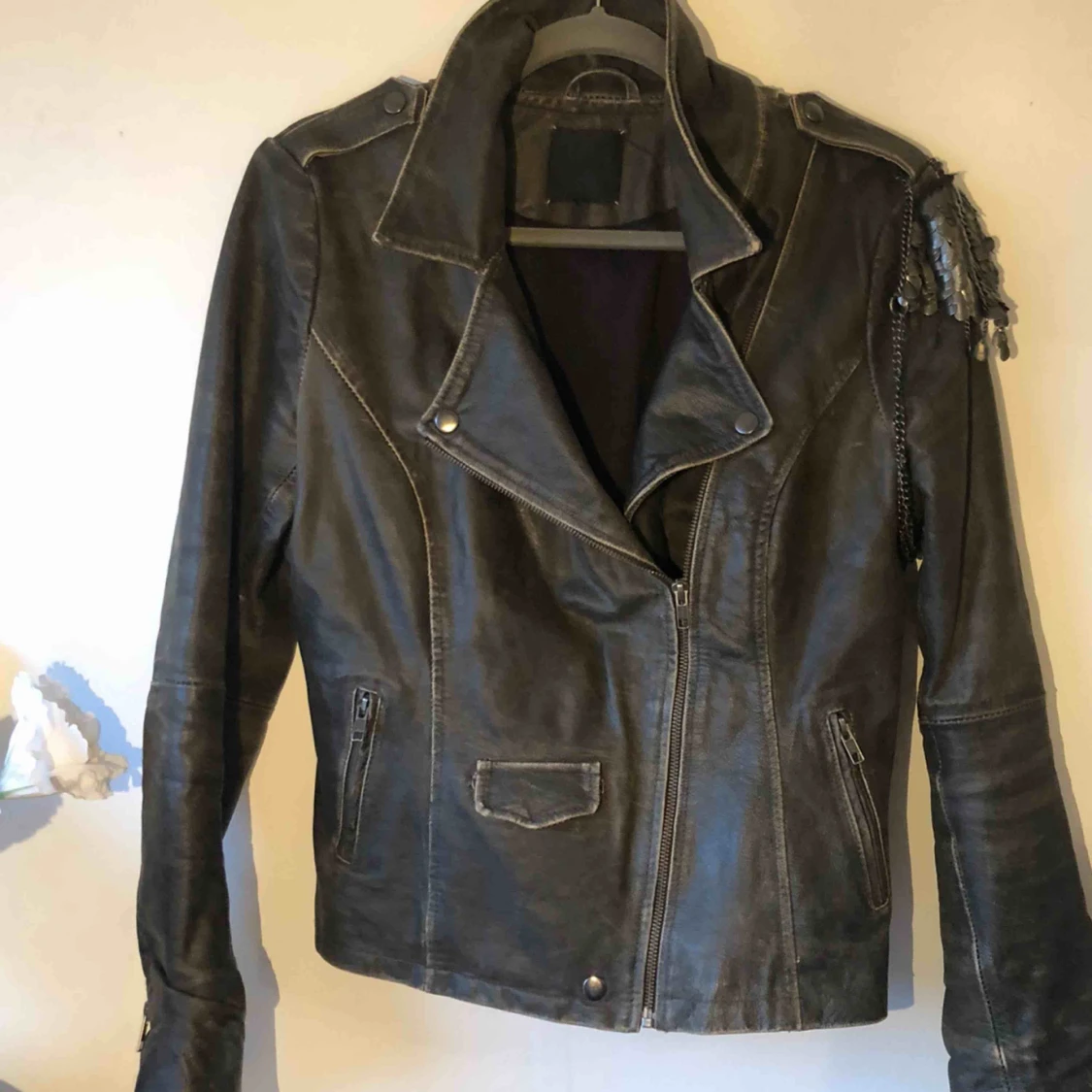 MC inspirerad skin jacka i äkta skin, jackan är ganska tjock och rejäl, har en detalj över ena axeln som går att byta plats på eller ta bort helt. Jackan är köpt på en mässa för något år sedan. Men den är aldrig använd.