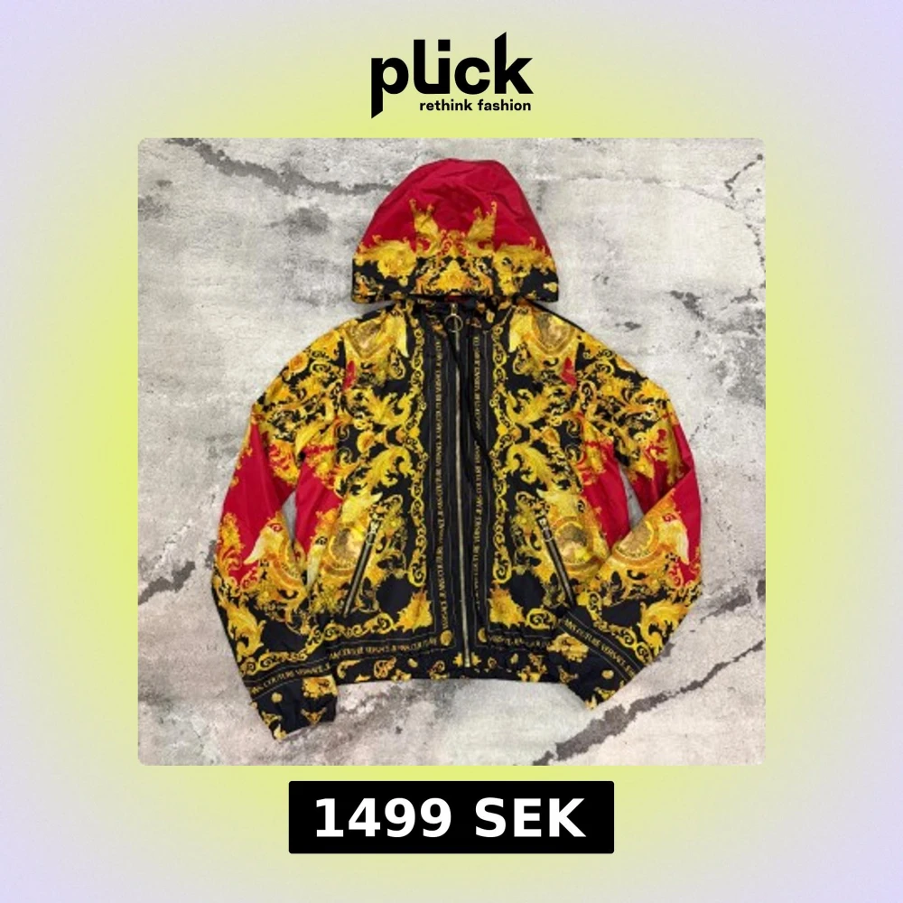 Säljer en Versace Jeans Couture vindjacka med ikoniskt barockmönster i guld och svart, samt röda detaljer. Jackan har huva, två fickor med dragkedja och snygga snörningar. Materialet är lätt polyester och jackan har en stor rund dragkedja framtill med Versace-logga. Storlek IT:40 vilket motsvarar S. Retail: 4800 kr. Äkthetskontroll kan man göra på själva hemsidan och använda koden som finns i jackans lappar (CLG) OBS! PRIS GÅR ATT DISKUTERA.