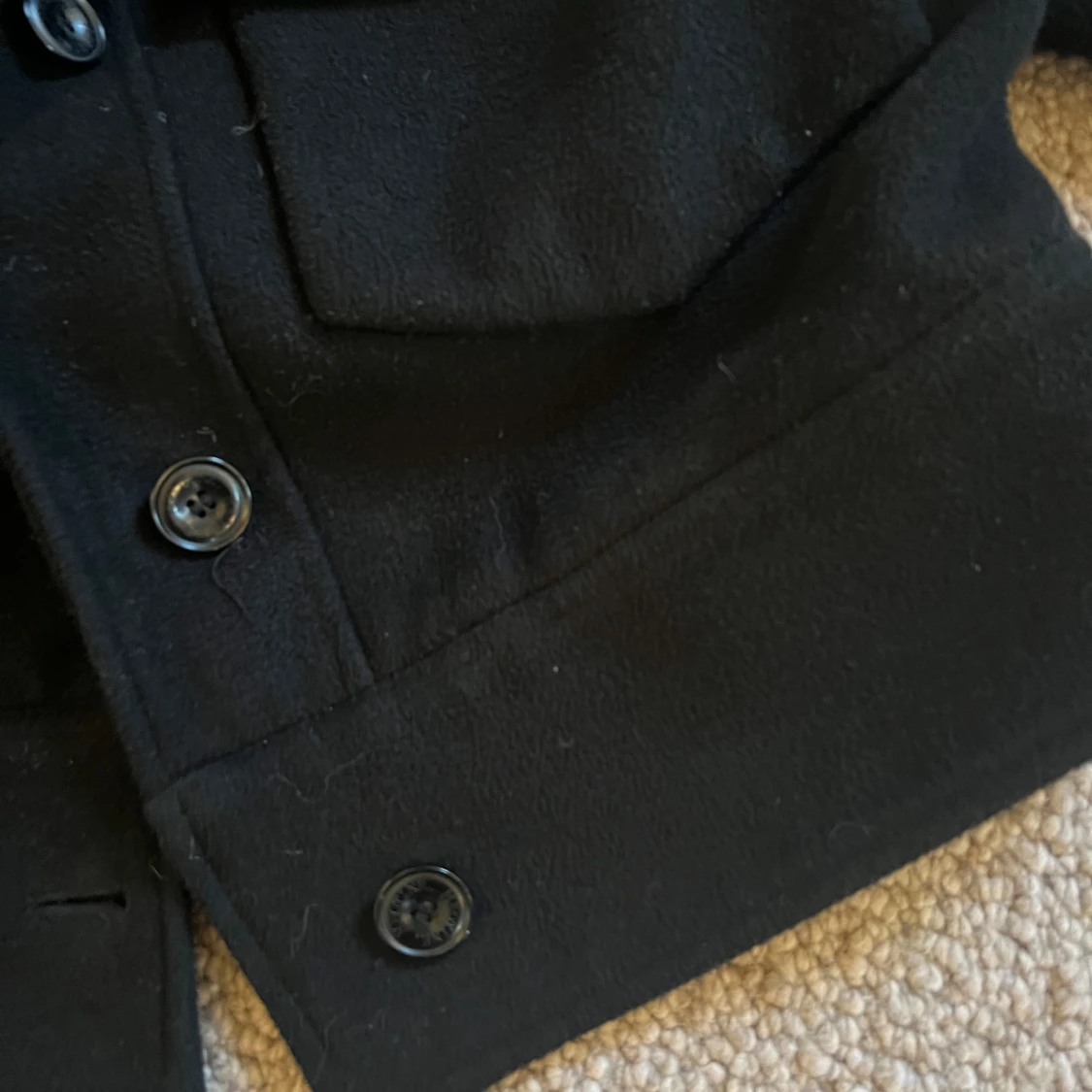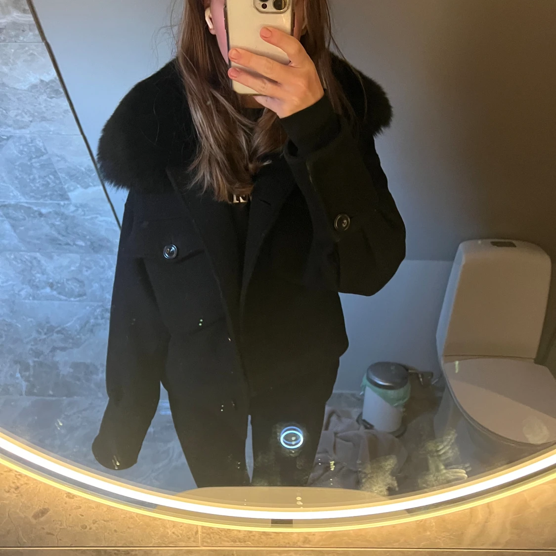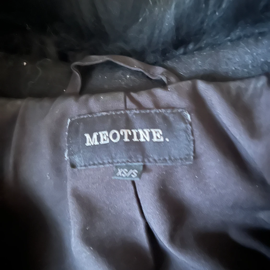 Säljer nu min fina svarta meotine kappa!! Tror inte första bilden är exakt samma jacka, materialet syns på fjärde bilden! Jackan är i fint skick, alla knappar och pälsen sitter kvar. Tyget har lite textur som också syns på fjärde bilden!💘 Nypris 3000