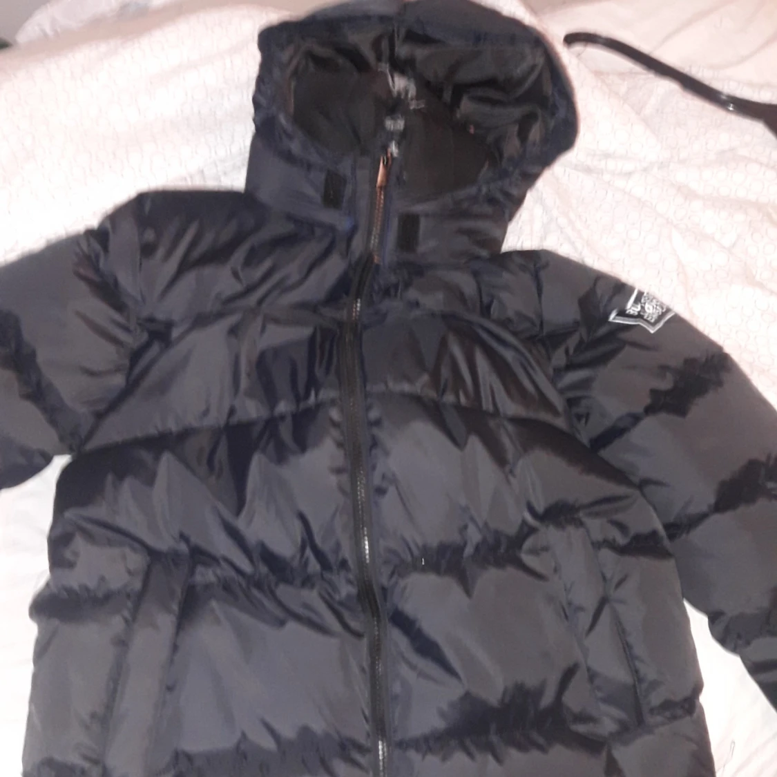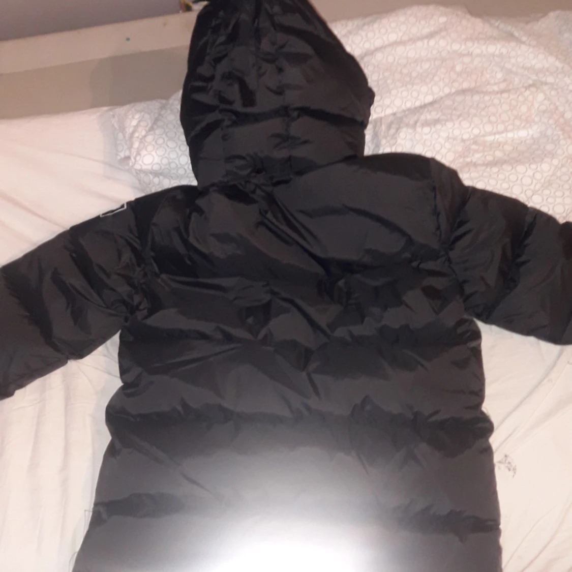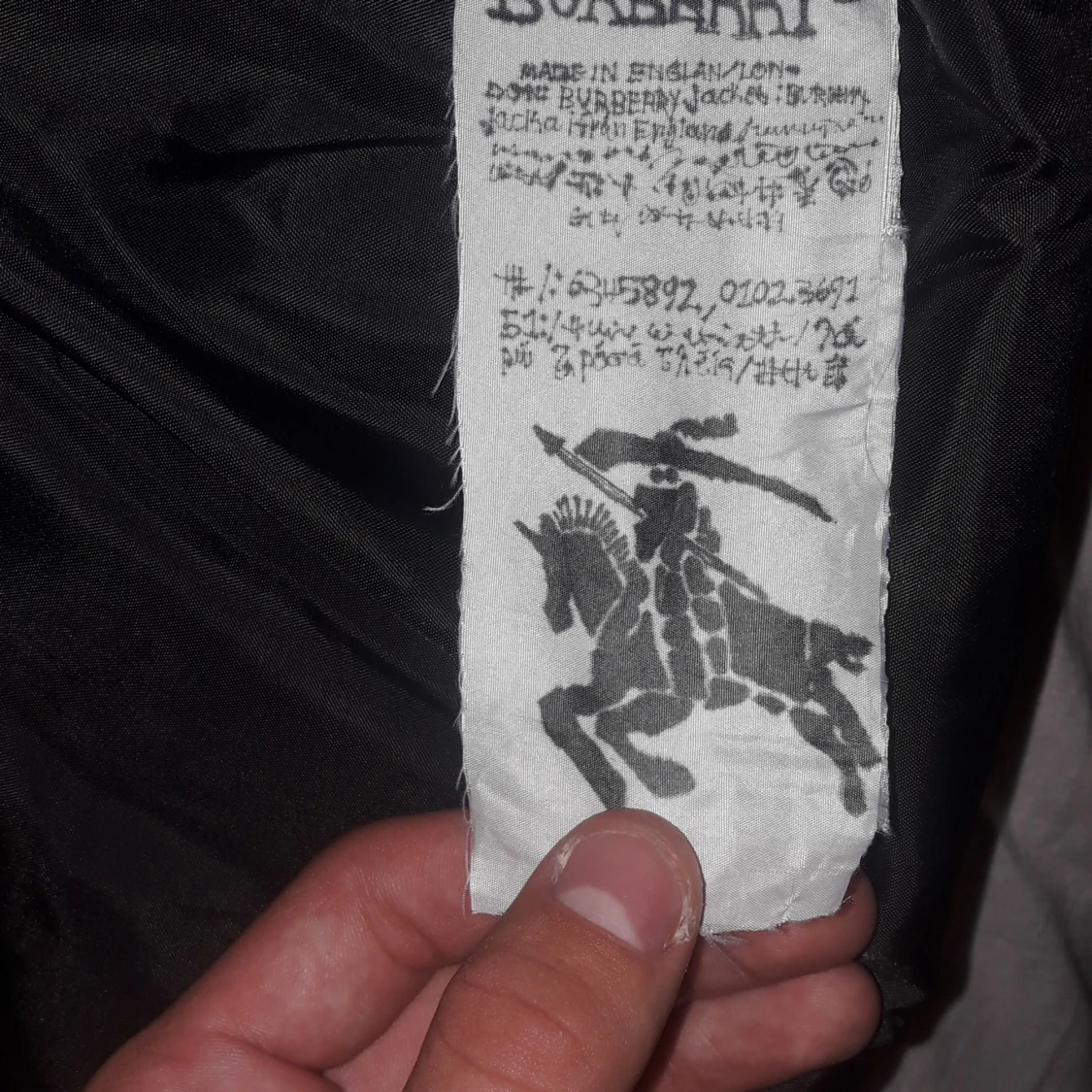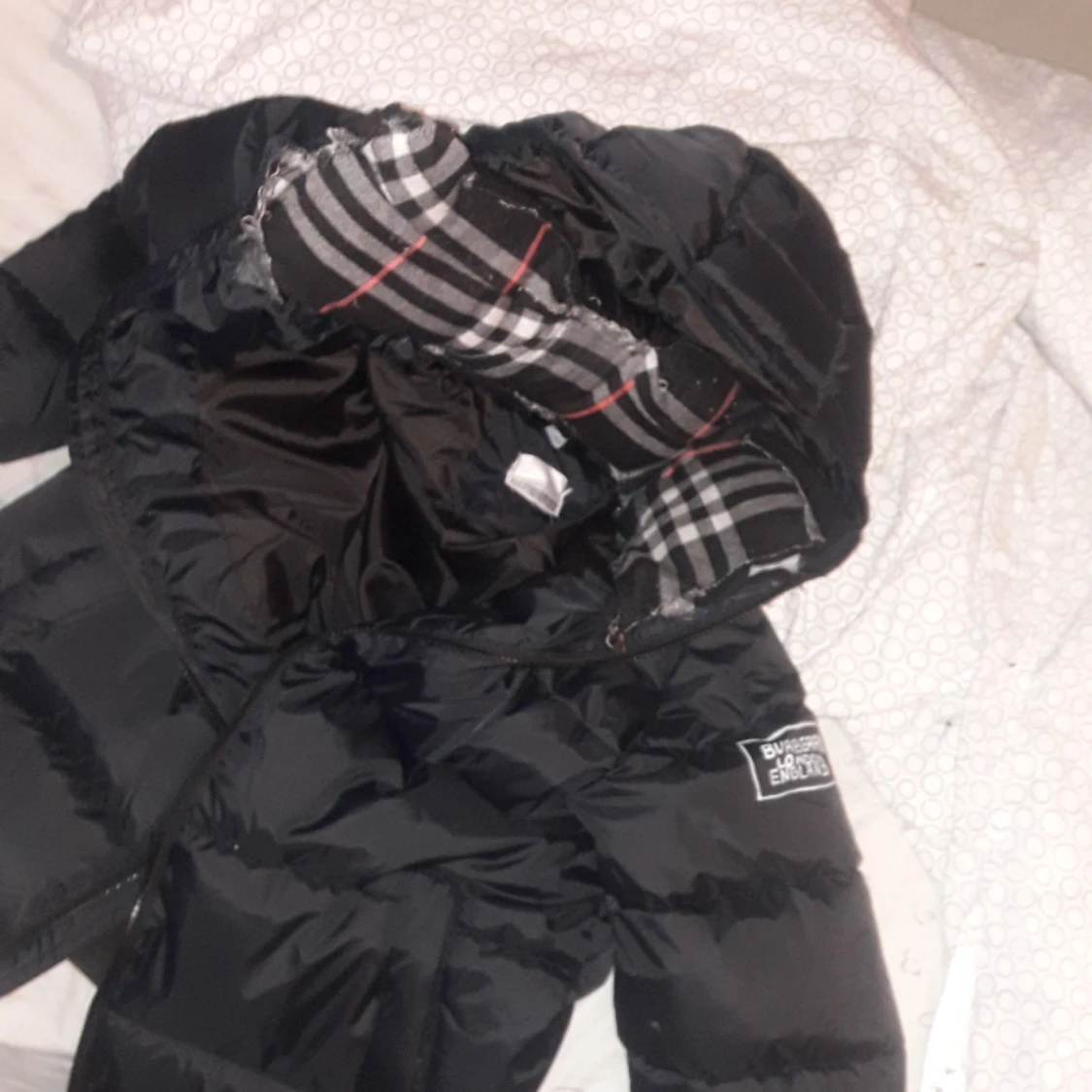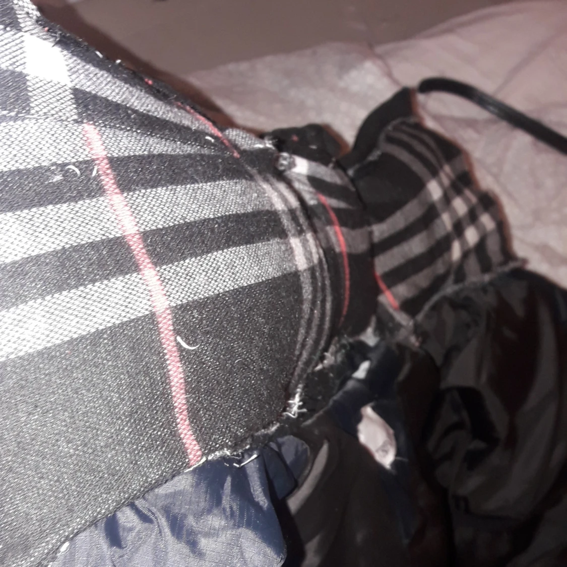 Säljer en svart pufferjacka från Burberry med klassiskt rutigt foder i svart, vitt och rött. Jackan har huva, dragkedja framtill och två fickor. Perfekt för kalla dagar och har en cool streetstil med märkets logga på ärmen.