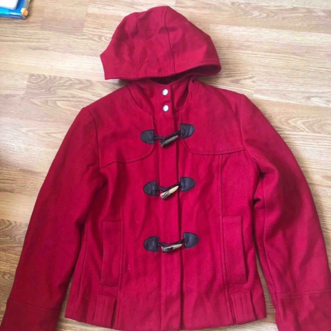 Jättesöt röd kort kappa/jacka från Mexx, med luva. Storlek 36 men liten i storlek så passar mer en 34 och XS eller barn i storlek 158/164