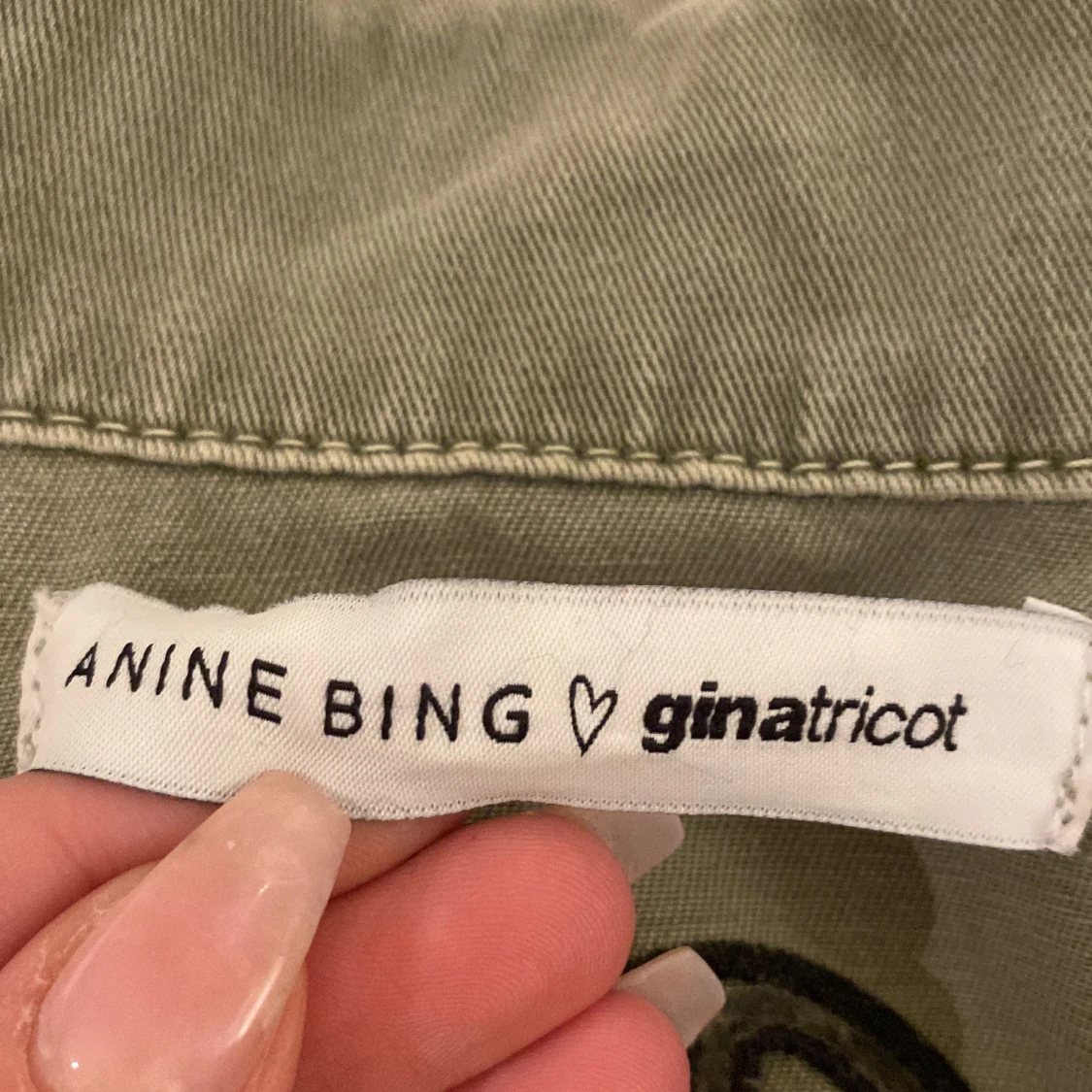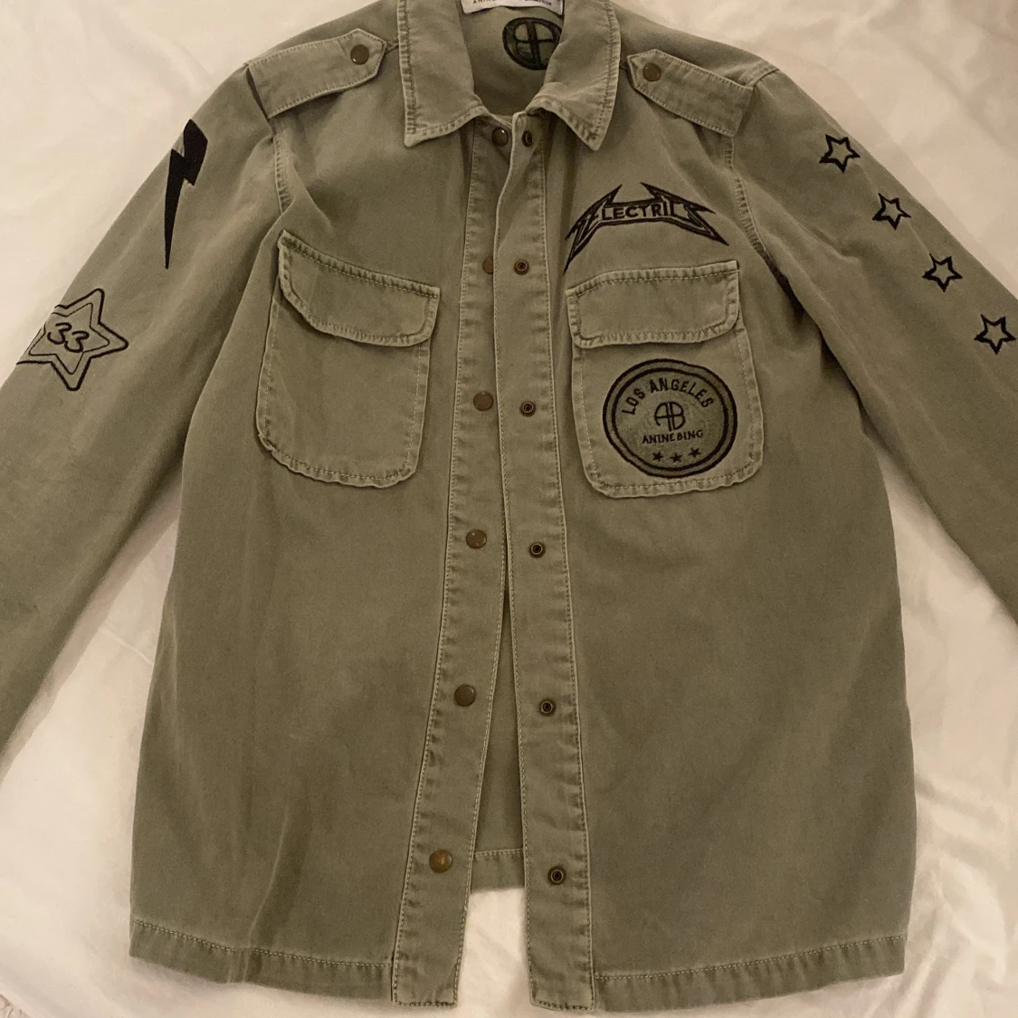 Snygg grön tunnare jacka med coola patches och tryck. Jackan har knappar framtill och två bröstfickor med lock. Bra skick