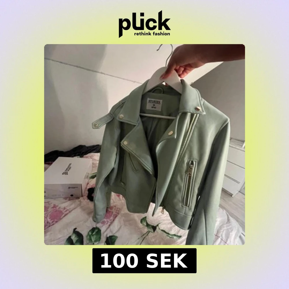 Snygg mintgrön skinnjacka från & Other Stories i bikerstil. Jackan har silvriga dragkedjor, klassisk krage med tryckknappar och coola detaljer vid axlarna. Perfekt för dig som vill sticka ut med en fräsch färg och edgy vibe.