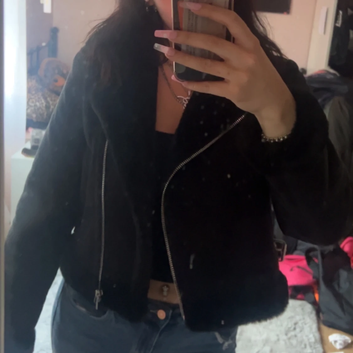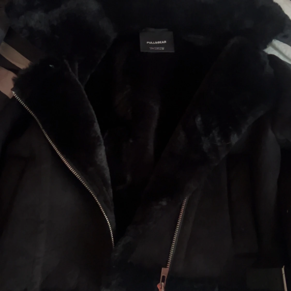 Säljer en svart pälsjacka från Pull&Bear, använd endast en gång så helt som ny. Jackan har en klassisk bikerstil och är fodrad med mjuk fuskpäls❣️