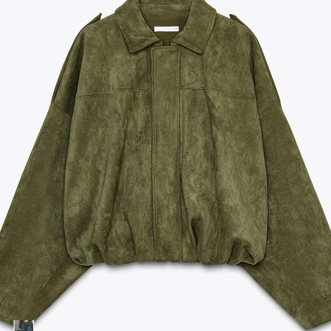 Säljer en sjukt snygg olivgrön bomberjacka i mocka med oversized passform. Jackan har bred krage, långa ärmar och en ball, puffig siluett. Perfekt för dig som gillar streetstyle och vill sticka ut med en unik look.