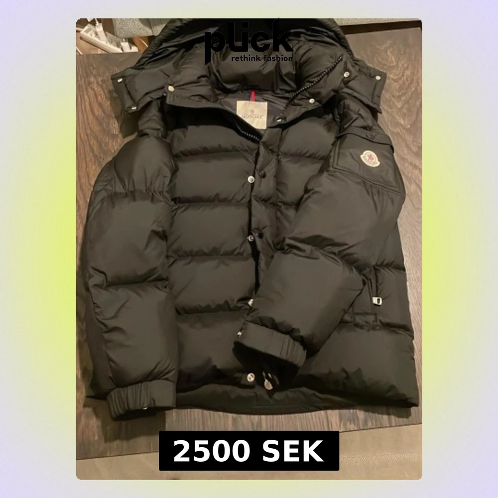 Svart pufferjacka från Moncler med huva och ikonisk logga på ärmen. Jackan har quiltad design, dragkedja och knappar framtill samt ribbade muddar vid ärmslut. Insidan har ett coolt serietryck och innerficka med dragkedja. Perfekt för kalla dagar.