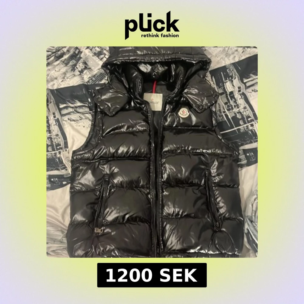 Säljer en svart, glansig dunväst från Moncler med huva och dragkedja framtill. Västen har två fickor med dragkedja och klassisk Moncler-logga på bröstet. Perfekt för lager-på-lager och snygg till streetwear. Fodrad och quiltad för extra värme.