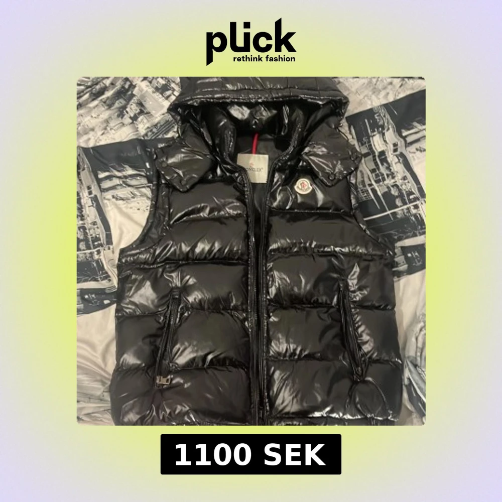 Säljer en svart, glansig dunväst från Moncler med huva och dragkedja framtill. Västen har två fickor med dragkedja och klassisk Moncler-logga på bröstet. Perfekt för lager-på-lager och snygg till streetwear. Fodrad och quiltad för extra värme.