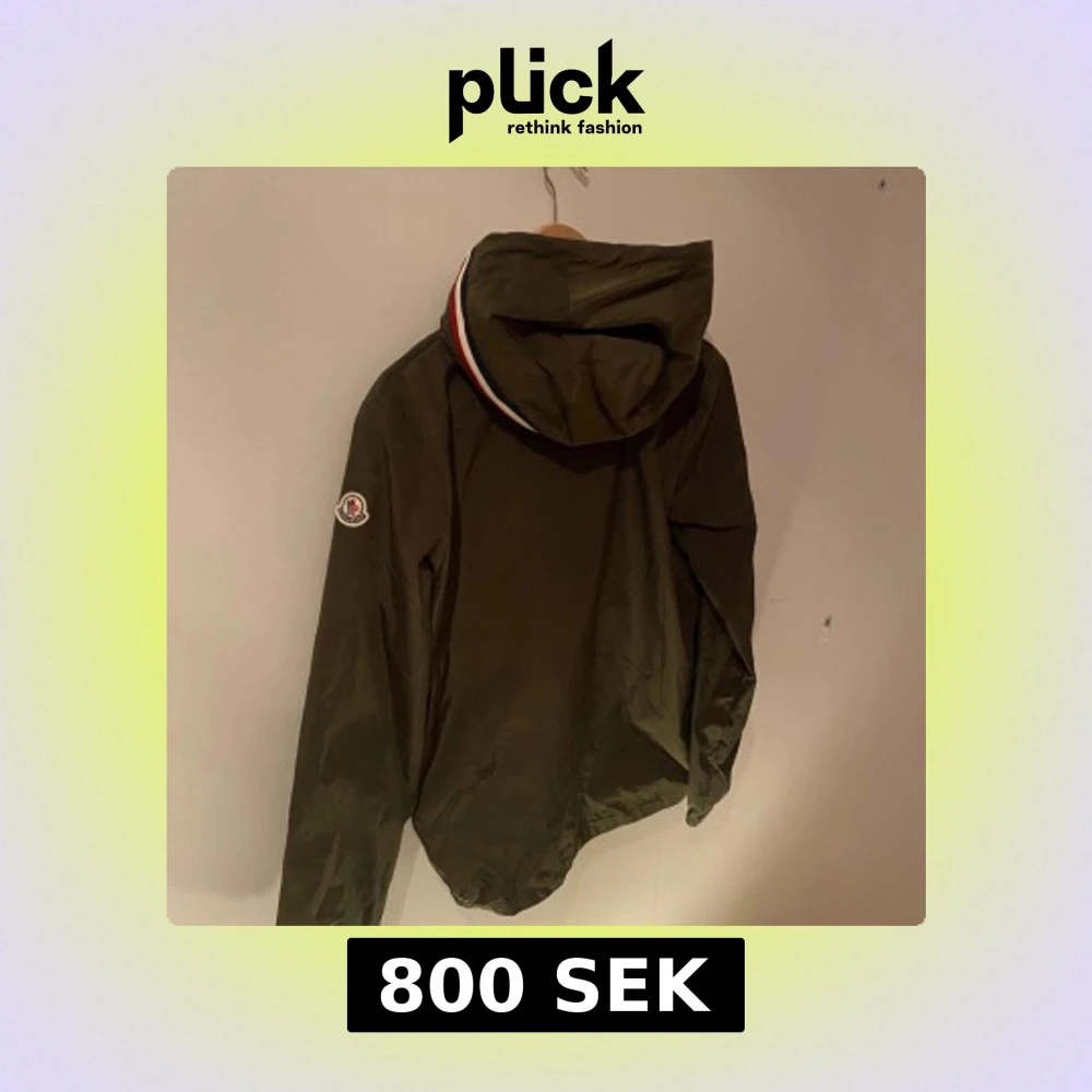 Snygg grön vindjacka från Moncler med huva och coola rödvita detaljer på kragen. Jackan har dragkedja framtill, snörning vid huvan och två fickor med knappstängning. Perfekt för dig som gillar stilren design och streetwear-vibe.