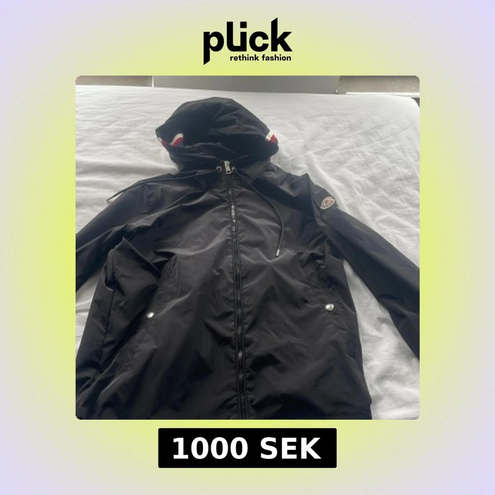Säljer en stilren svart vindjacka från Moncler med huva och dragkedja. Jackan har en diskret logga på ärmen och silverfärgade knappar på fickorna. Perfekt för blåsiga dagar med sin lätta och funktionella design säljer den för 1000kr för den är lite sönder där nere vid dragkedjan o för den it används längre