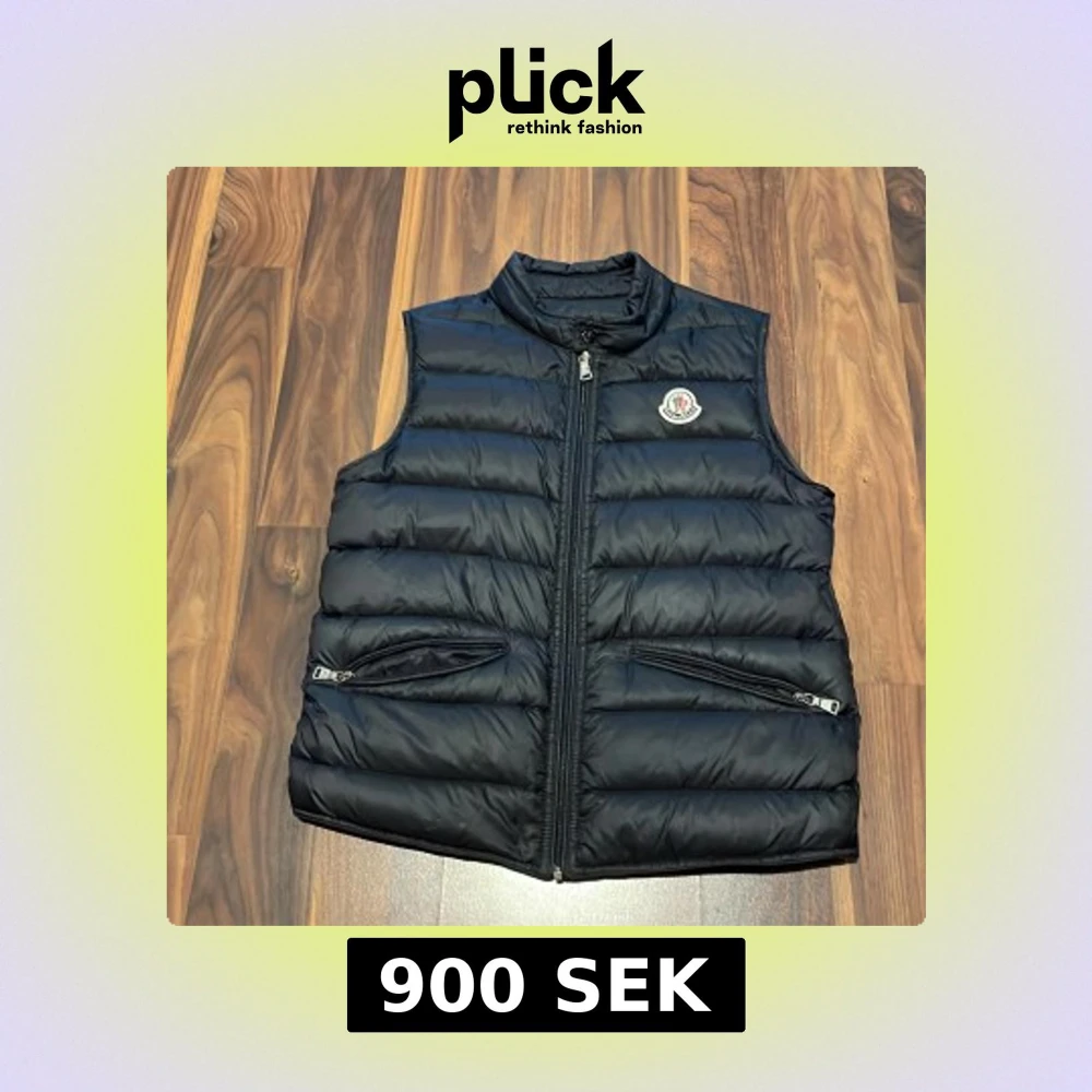 Snygg svart dunväst från Moncler med klassisk quiltad design och hög krage. Västen har två fickor med dragkedja och Moncler-logga på bröstet. Perfekt att slänga över en hoodie för en cool look.